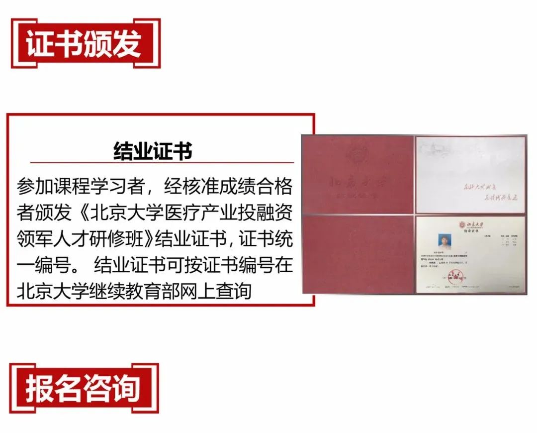 毕业可获得北京大学结业证书、北大校友资源、和医疗行业资源对接。现面向药企董事长和创始人,投资机构投资人等招生。咨询渠道见文末。