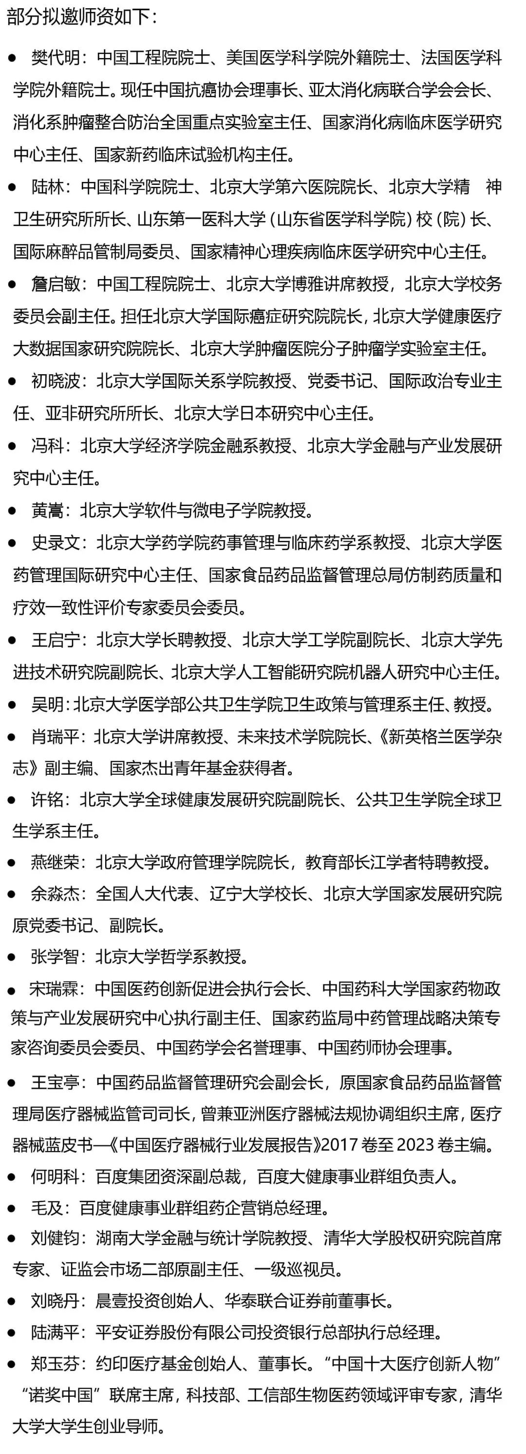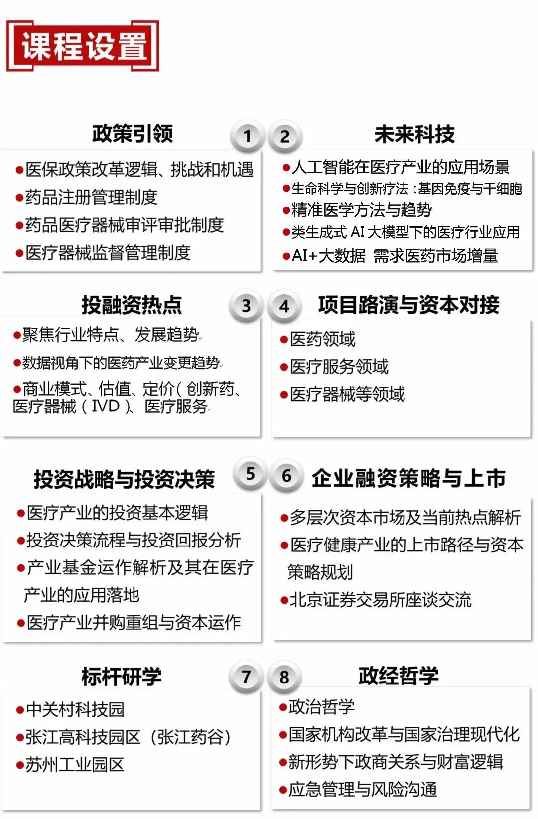 北京大学医疗产业投融资领军人才研修班,由多位院士领衔、北大教授、国家药品监督专委会成员、头部投资机构董事长创始人等联合授课。