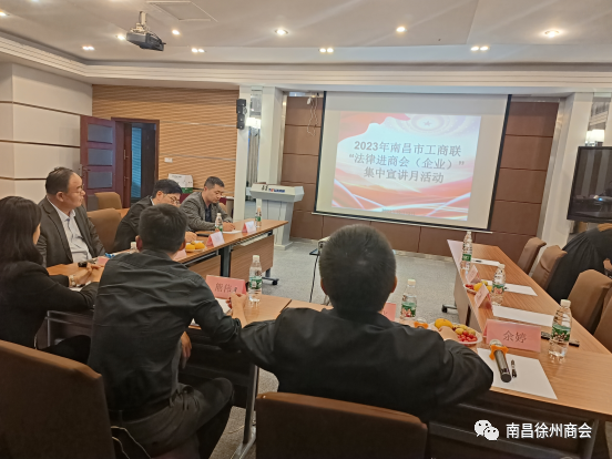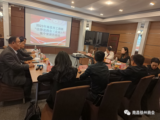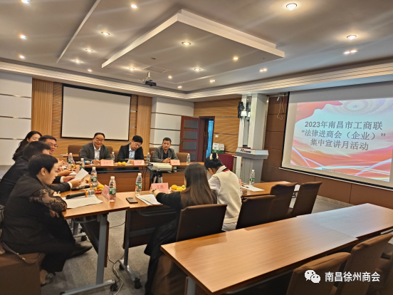 2023年10月13日由南昌市工商联副主席陈东飞、市工商联宣教科负责人熊伟、商会党建办公室三级主任科员余婷、律师王依梦组成的考评小组莅临南昌徐州商会考察交流,同时开展了2023年南昌市工商联“法律进商会(企业)