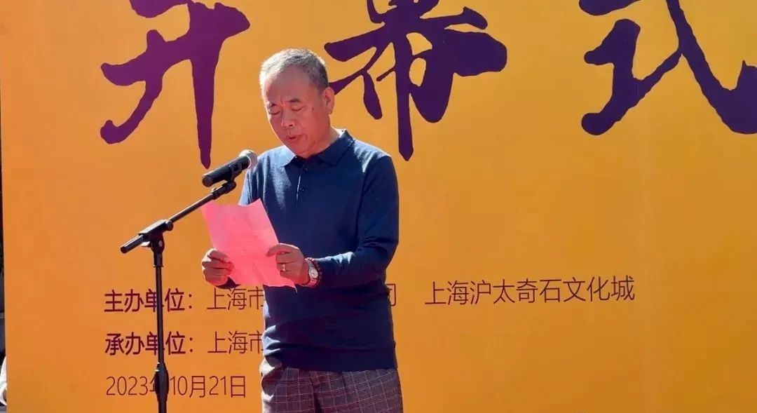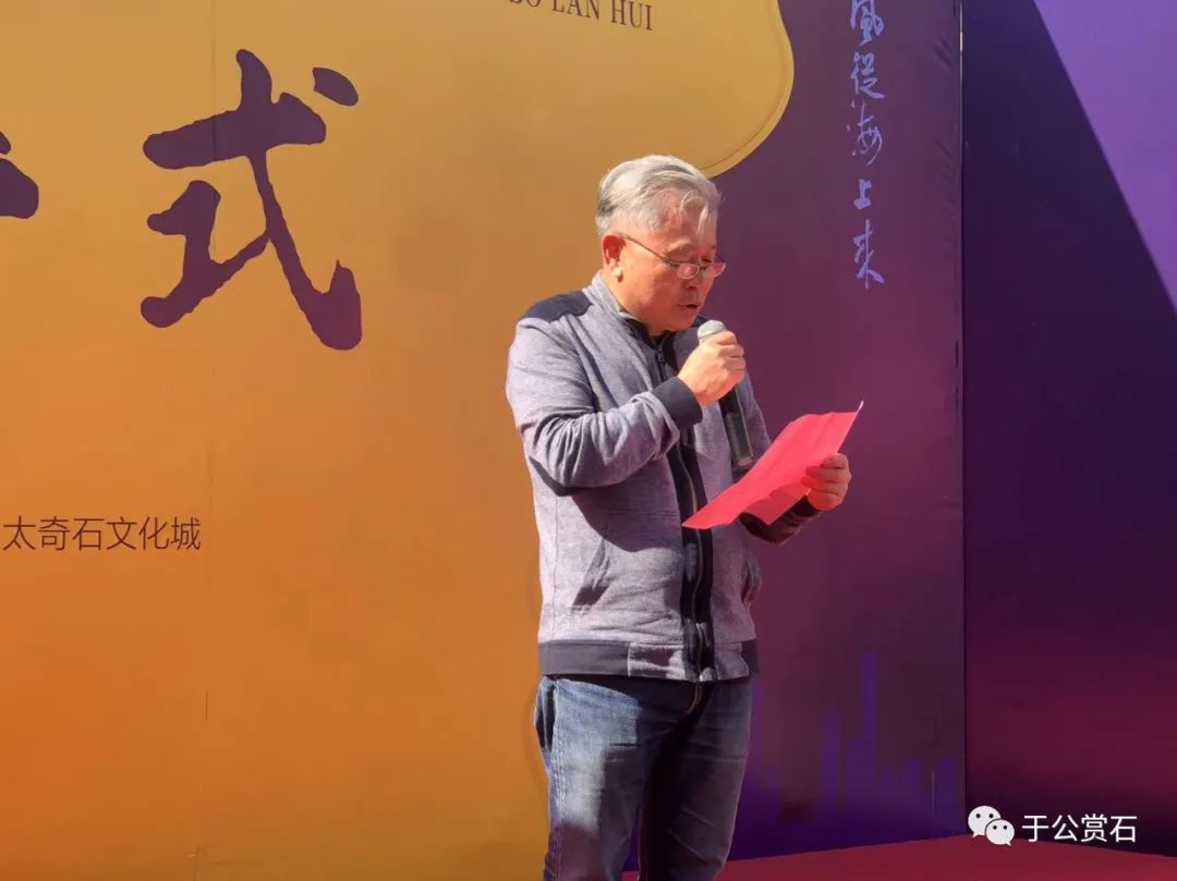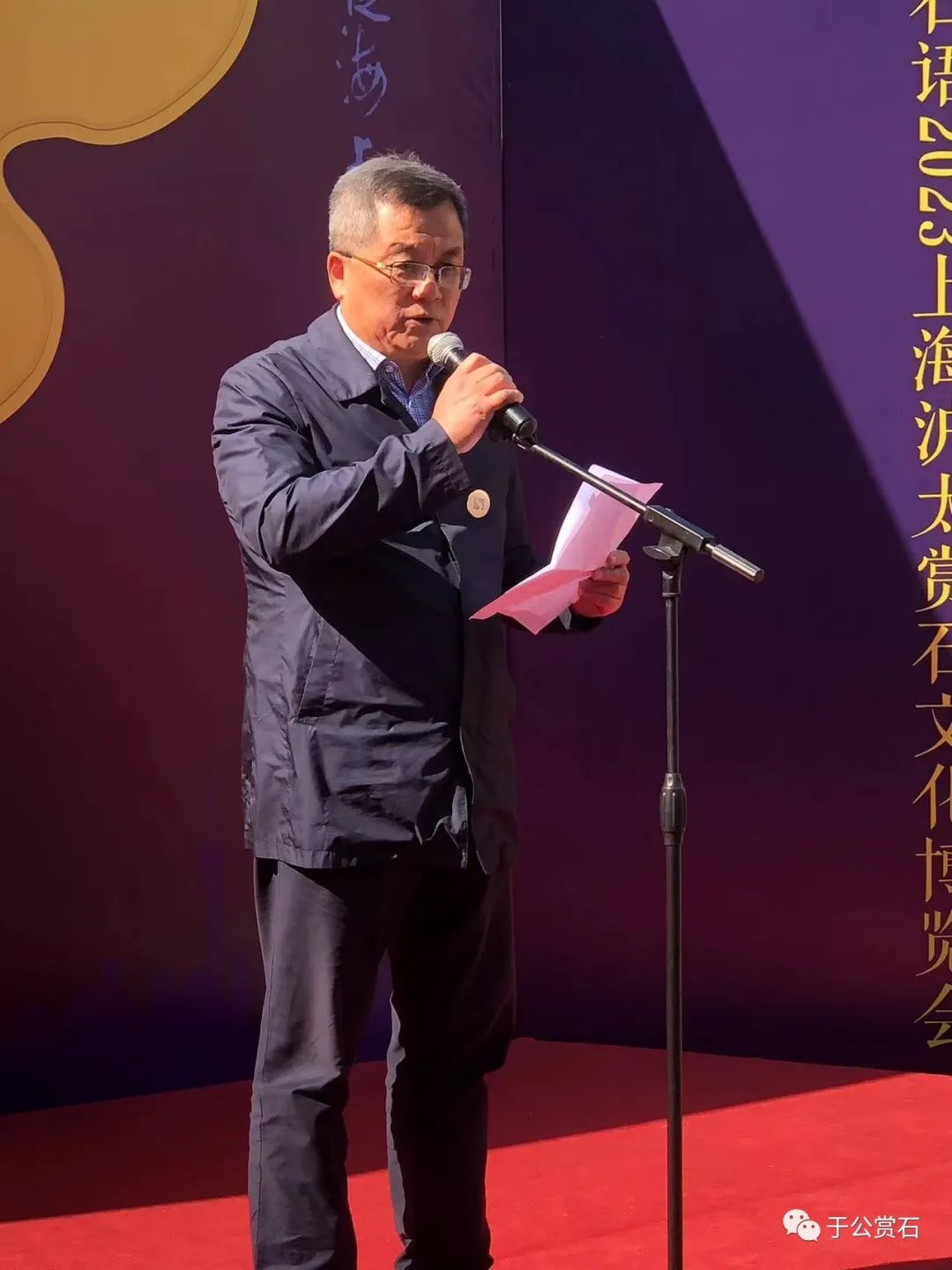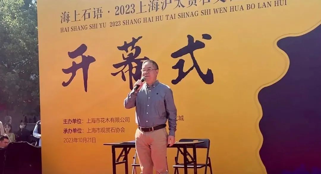 开幕式首先由本届博览会组委会执行主任、上海市观赏石协会会长杜海鸥先生致辞。他讲到。此届赏石文化博览会,我们不仅突破了疫情和经济给我们带来的石市低迷,还成功地首次让海派传统赏石与海派现代赏石共登一台,让赏石文化走进了“小白楼”的博物馆艺术殿堂,跨过浦江,实现二岸同展和海派赏石标志性个人展,还利用“上花源”优势,第一次举办兄弟省市的赏石团体合作展。此届赏石文化博览会,是上海赏石界集各方有利资源,重新打造海派赏石品牌的实践与跨界,一次别开生面的赏石文化尝试。在此,我们要感谢中石协与兄弟省市赏石协会的大力支持,感谢建工园林集团、普陀区有关部门、上海收藏家协会、朵云轩、吴昌硕纪念馆、上海盆景协会等文化部门的支持,更要感谢这次前来参展的全国各地石友与团队对我们的信任和支持。上海市观赏石协会在成立28年历史上,首次在沪太奇石市场综合性开展大型展销会、现代赏石精品展、“上花源”团体展、“小白楼”传统赏石展和浦东“璞石斋”徐文强赏石心路回顾展等五个单元展举办,首次在海上石语平台上迎纳百户千方精品,首次在同一个时空里,让传统赏石与现代赏石,让赏石艺术与园林艺术,让海上精品与全国石友,让公共艺术与城市风情在这盛会中融合交流,缤纷呈现,这足以使上海石界有望重拾信心,走向远方。