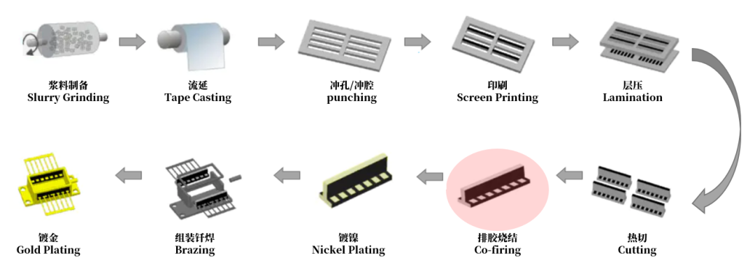 陶瓷封装外壳的主要结构包括多层陶瓷基体、金属环框,封装盖板、引线框架、散热底板等。多层陶瓷外壳制造技术,包括原材料制备、流延、冲孔冲腔、金属化印刷、层压、热切、烧结、镀镍、钎焊、镀金等技术;其封装过程涵盖外壳清洗、装片、清洗、引线键合、封盖、外引线处理、打标、检测等。涉及的材料包括:氧化铝、氮化铝等陶瓷粉体、以及匹配的金属化浆料(钨浆、钼锰浆料)、可伐合金、焊料、热沉等;设备包括多层陶瓷制造需要的粉体研磨机、流延机、冲孔机、印刷机、叠片机、层压机、热切机、排胶烧结、钎焊设备、电镀、化学镀、清洗设备、贴片机、引线键合机、封盖机、平行缝焊机、切筋机、打标机、外观检测、膜厚测试仪、氦气检漏仪、性能检测、老化设备等。