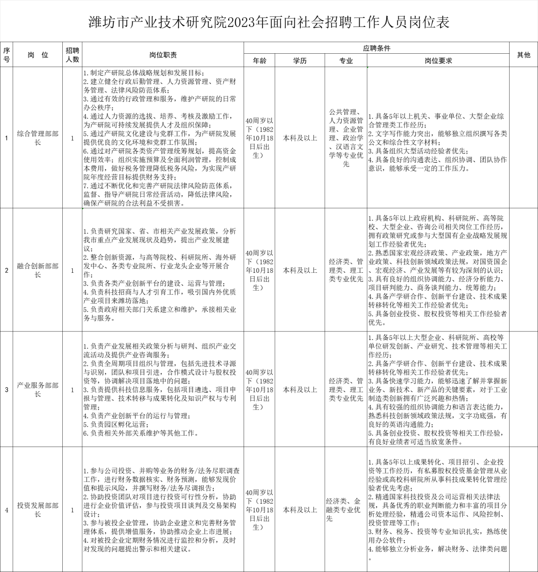 潍坊市产业技术研究院(简称“市产研院”)是由潍坊市人民政府举办的事业法人单位,于2019年9月10日揭牌成立。实行企业化管理、市场化运营,设立投资发展有限公司,搭建“产研院+公司+基金+各类创新主体+孵化园区”的框架结构。市产研院已有加盟院8家、合作单位12家,已入驻10家专业研究机构,携手中科院等8家高校院所成立研究院和技术转移中心。联合湾区金融共建“潍坊国际科技金融服务中心”,设立10亿元科技企业培育基金,联合潍坊市城投设立10亿元产业创新发展基金。现根据业务发展需要,面向社会诚聘优秀人才。