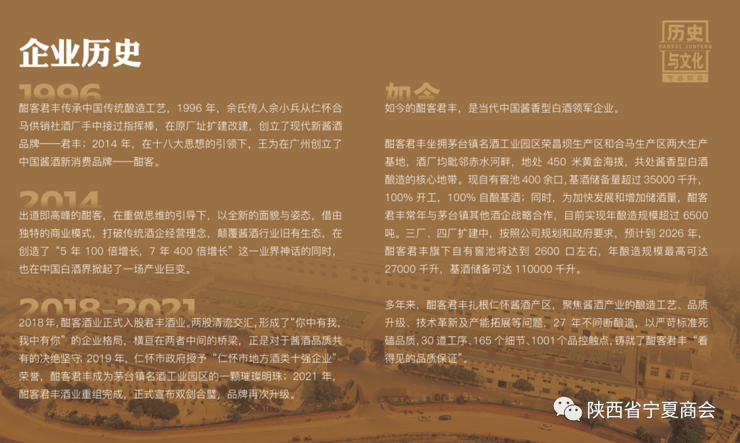 公司自成立以来专注于酣客酱酒的销售经营,文化艺术交流活动的策划组织,遵循“认知盈余+终端体验+消费享受”的领先模式,完成经营闭环。在陕西区域拥有自品牌终端“酣客酒窖”50余家,文化实体“酣客酱酒体验馆”超过6家。