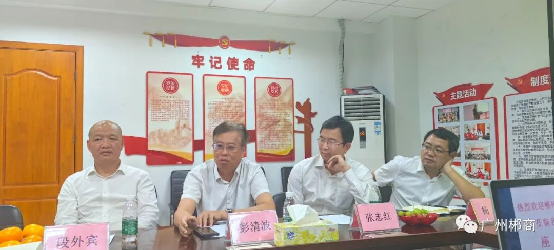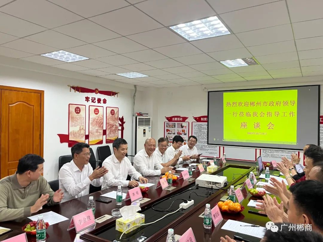 10月19日,郴州市政府副市长杨平、市政府秘书长段外宾、市政府驻广办主任李明及在粤郴籍领导保利长大工程有限公司专职党委副书记、中共保利长大党校校长彭清波,广州培正中学书记、校长张志红,郴州市政府驻广办原党组书记、广州市湖南郴州商会首席招商顾问陈晓芳一行莅临广州市湖南郴州商会指导工作,并召开在粤部分郴州商会代表座谈会。