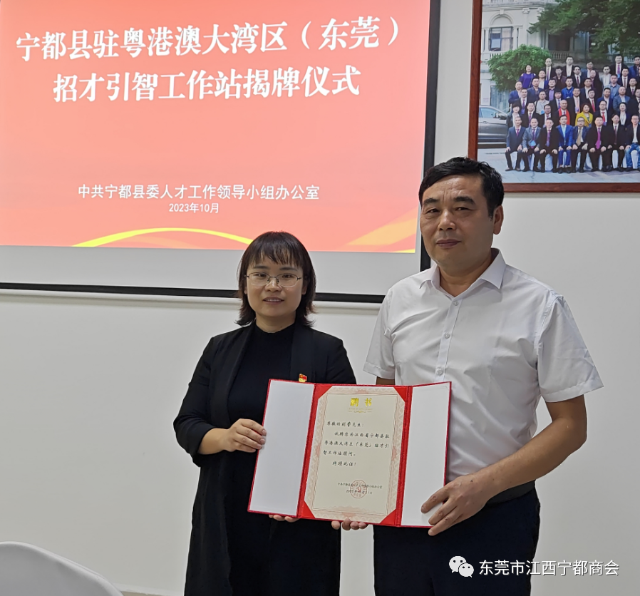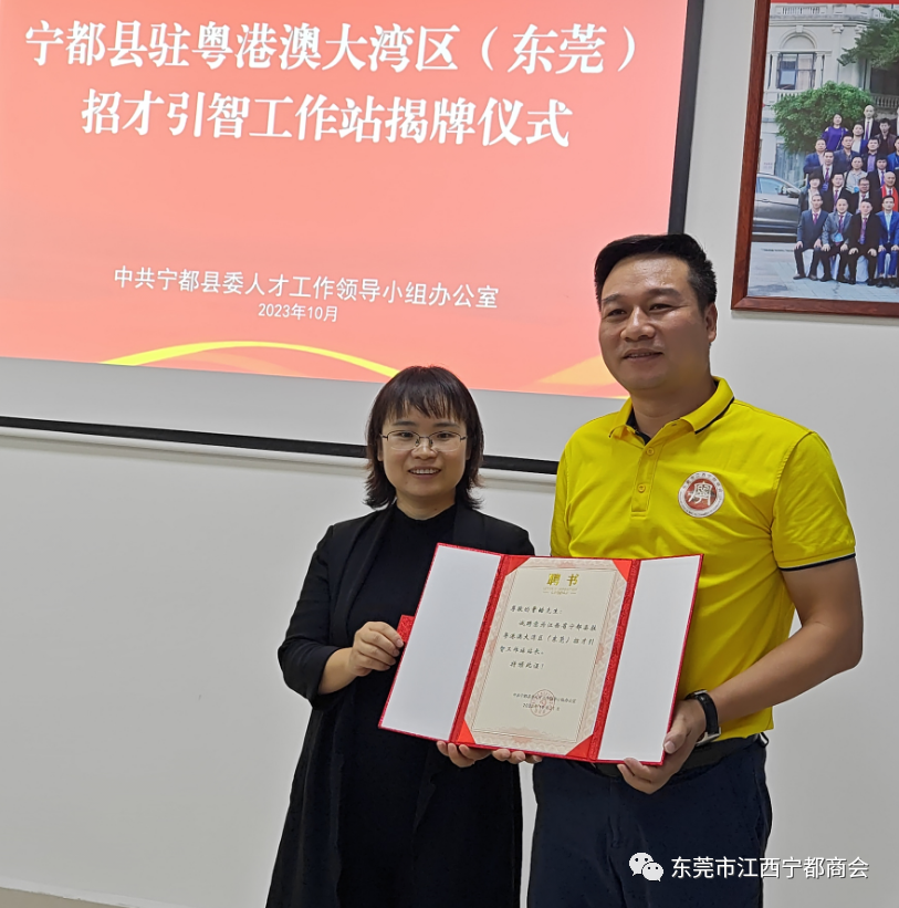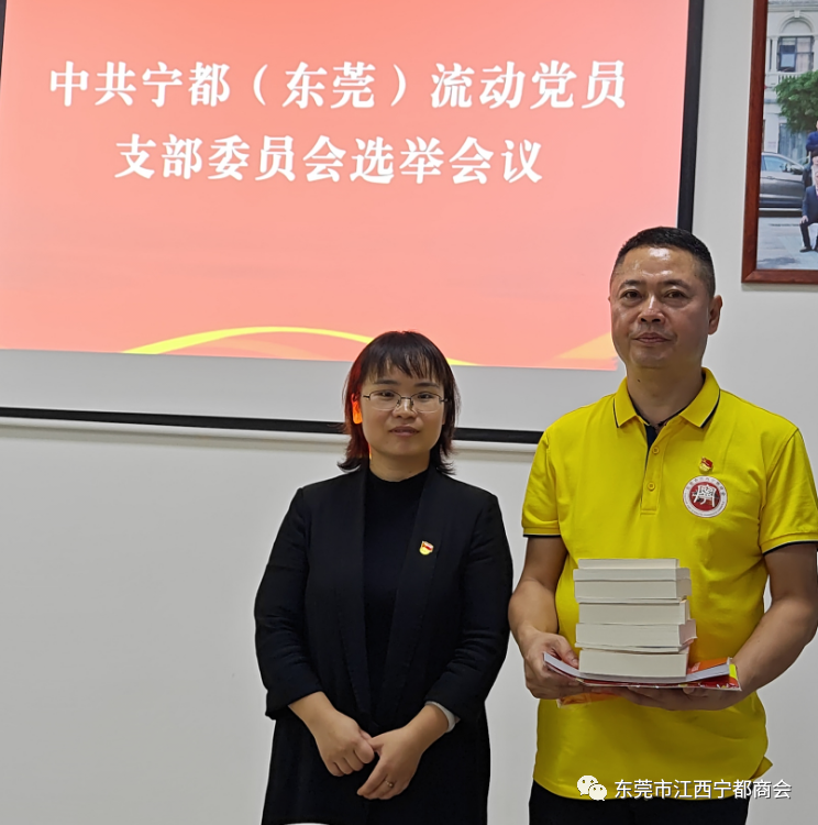 10月21日下午,宁都县委组织部副部长倪国英,宁都县委组织部两新党建室干部严彬彬莅临东莞市江西宁都商会进行中共宁都(东莞)流动党员支部委员会选举会议及宁都县驻粤港澳大湾区(东莞)招才引智工作站揭牌仪式。