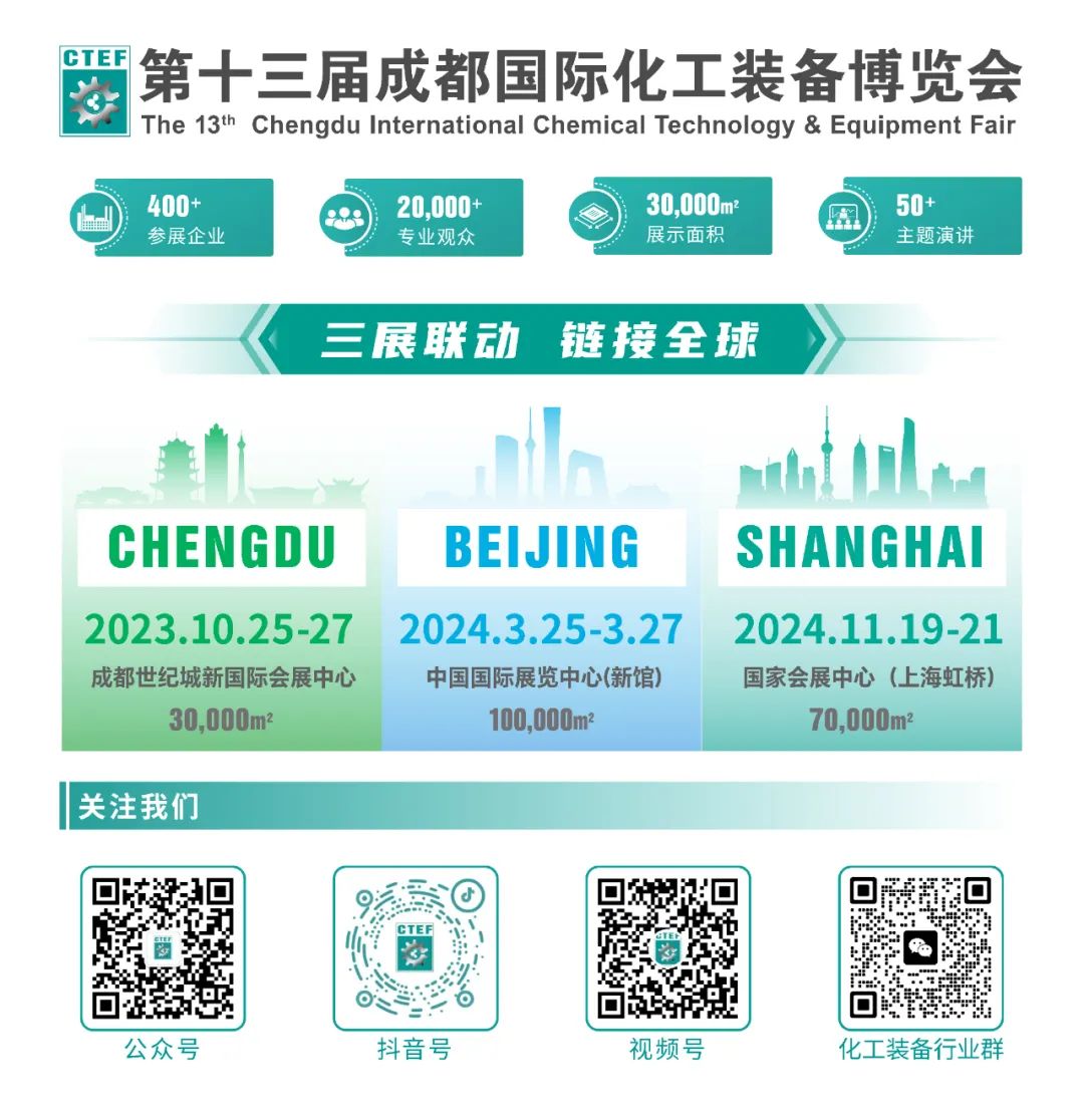 2023成都国际化工装备博览会(CTEF 2023)将于10月25-27日在成都世纪城新国际会展中心召开。CTEF成都化工装备展覆化工装备全产业链核心技术与产品,致力于打造一站式的互动交流平台,并积极探索化工装备新技术新设备在工业领域的示范和应用。