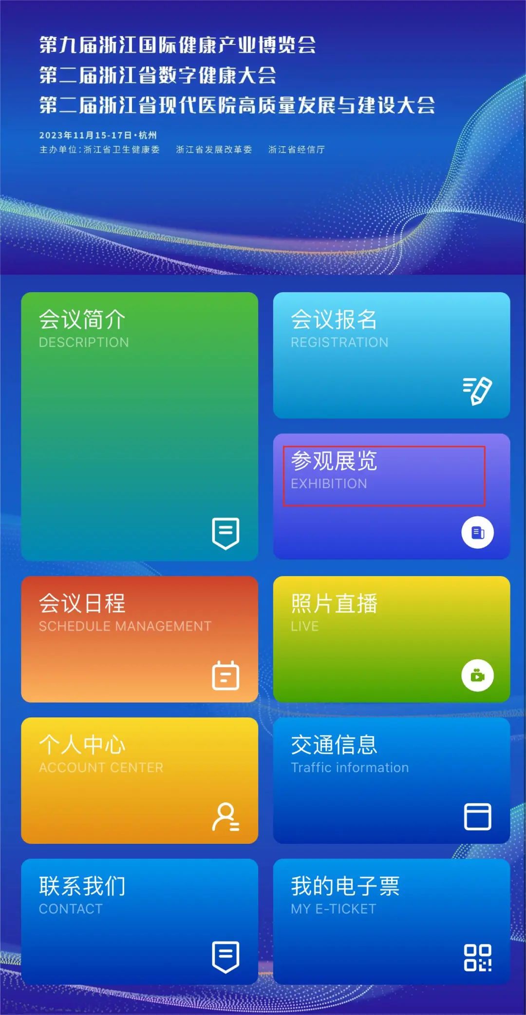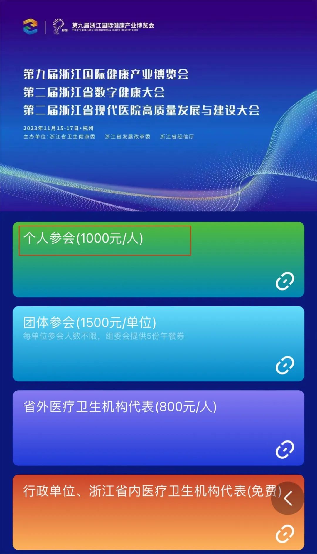 由浙江省卫生健康委、浙江省发展改革委、浙江省经信厅主办,浙江省健康服务业促进会承办,浙江省卫生信息学会、筑医台联合承办的第九届浙江国际健康产业博览会将于2023年11月15-17日在杭州国际博览中心3B召开。大会报名通道现已开启,报名流程如下: