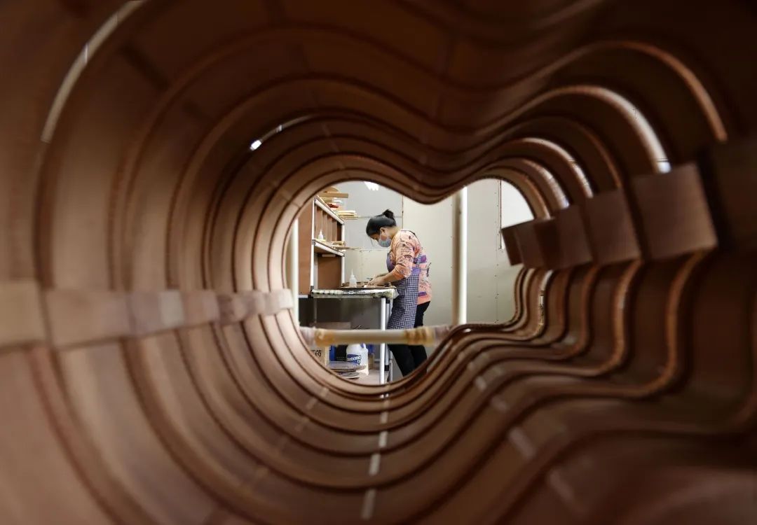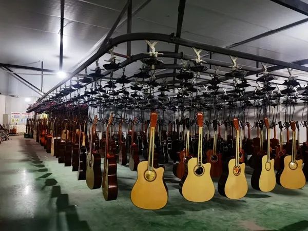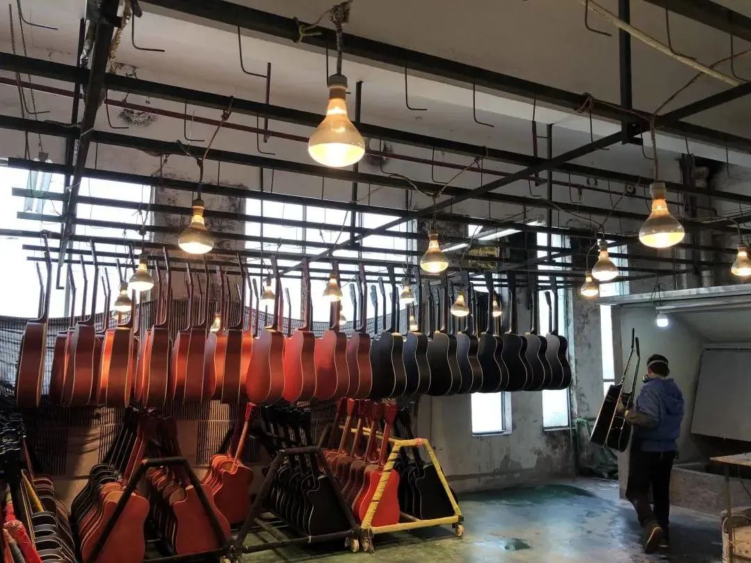 “通过打磨、喷漆给吉他上色,原木色的吉他就会有各种各样的颜色,再用暖灯照射进行干燥,一个熟练的技工师傅通过色泽亮度,就能判断出烘干到位了没有,确认合格后才能送到下一个车间装配零件。”