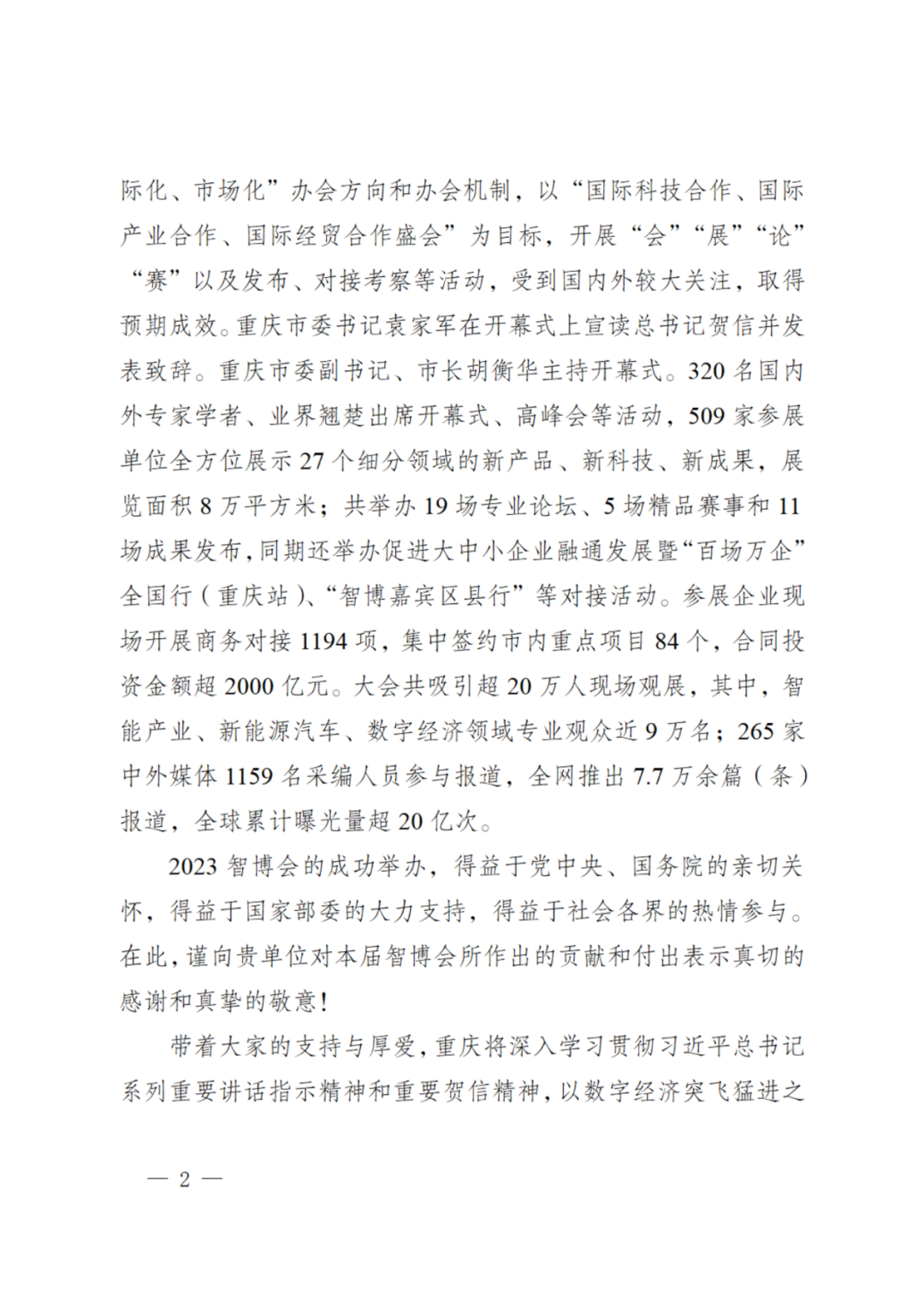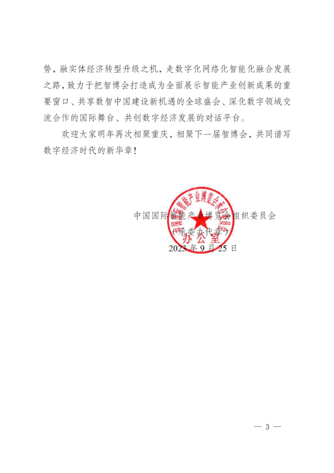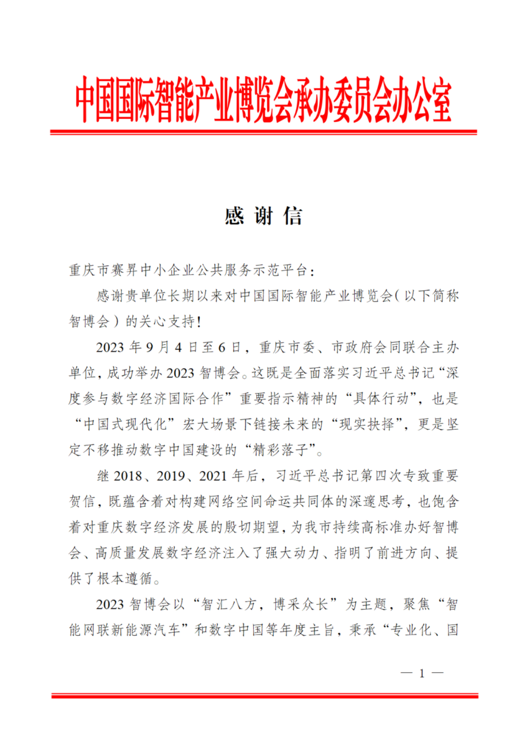 2023年9月28日,由重庆赛昇运营的重庆市赛昇中小企业公共服务示范平台收到来自中国国际智能产业博览会承办委员会办公室的感谢信。重庆赛昇在2023年9月4日至6日的2023年智博会举办期间,积极参与2023年智博会第三届制造业数字化转型高峰论坛活动筹办工作,以及参与支持2023年智博会大中小企业融通发展对接活动。