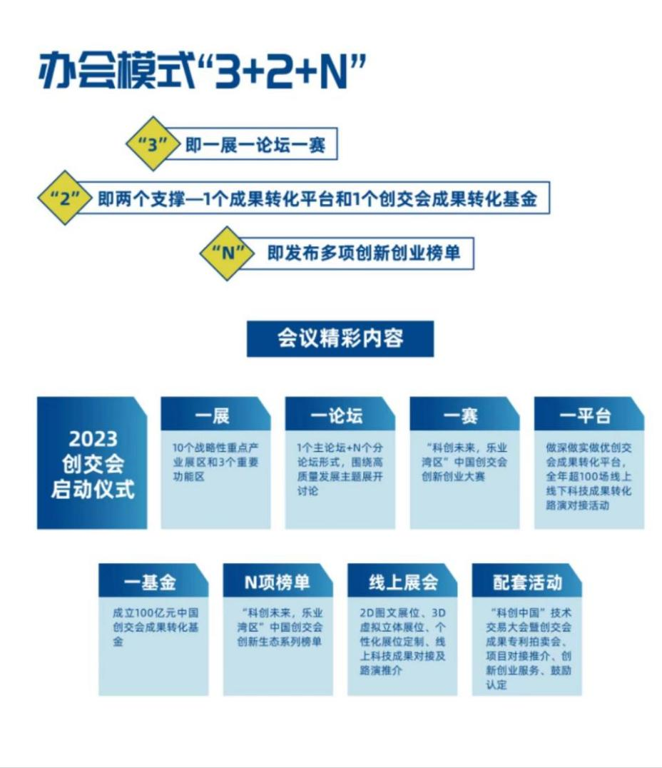 本届创交会以“赋能新赛道,共促新发展”为主题,以“3+2+N”为办会模式(“3”即一展一论坛一赛;“2”即两个支撑,1个成果转化平台和1个创交会成果转化基金;“N”即发布多项创新创业榜单),重点聚焦“十四五”战略性新兴支柱产业和新兴优势产业,设立10个战略性重点产业展区和3个重要功能区,线上线下展示交流对接项目成果不少于6000项;围绕成果对接交易中心任务,同期将举办论坛峰会、成果拍卖、技术转让、项目路演等专项活动20余场,依托创交会成果转化基地和成果交易服务平台,全年常态化开展线上线下对接活动100场。