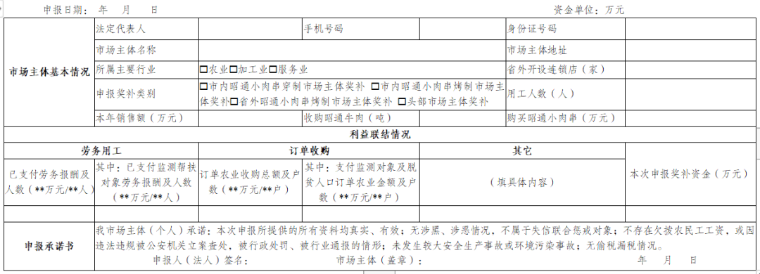 填表说明:1.省外开设连锁店:申请头部市场主体奖补时填写,没有可不写;2.本年销售额、收购昭通牛肉、购买昭通小肉串:市场主体对应奖补条件,涉及的则填写,没有可不写,同时需一一对应材料清单提交相关材料;3.劳务用工:已支付劳务报酬及人数填写总的支付多少万元,涉及多少人。其中:已支付监测帮扶对象劳务报酬及人数填写总的支付多少万元,涉及多少人;4.订单收购:订单农业收购总额及户数填写总收购多少万元,涉及多少户。其中:支付监测对象及脱贫人口订单农业金额及户数填写总收购多少万元,涉及多少户;5.其它:根据具体情况填写清楚利益联结情况即可。