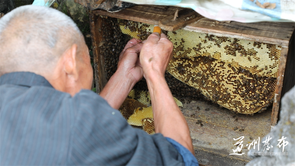 在菖路村的石山脚下,蜂鸣阵阵,不少土蜂箱摆放在树林下的各个石头缝中,成群的蜜蜂围绕着蜂箱飞舞。今年66岁的蜂农李正宏正熟练地打开蜂箱用刀割下蜂蜡,尽管没有全副武装,李正宏也显得格外镇定,随后将切割下来的蜂蜡捣碎,放置压蜜机内过滤、压榨,不一会儿半桶甜蜜的百花土蜂蜜就压制出来了。蜂糖呈琥珀色,十分黏稠,还能闻到淡淡的花香。