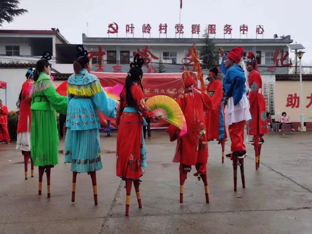 叶岭村文化遗存有一支铜器表演队伍,每逢春节,队员们身着传统表演服,踩高跷、划旱船、牛秧歌,精神饱满。锣、钹、镲等随着大鼓鼓点节奏的疏密和力度的强弱,不停地变换手法和节奏。郑州被确定为中央广播电视总台2020年春晚分会场后,央视春晚导演组在全省选拔民俗文化队伍,参加2020年央视春晚郑州分会场演出,其中嵩县被选中了3支队伍,其中就有城关镇叶岭高跷,并有分会场组委会颁发荣誉证书。