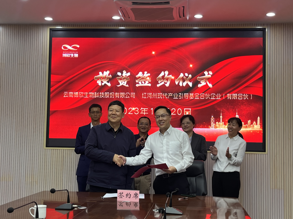 10月20日,云投基金管理的红河州产业引导基金与云南博欣生物科技股份有限公司(下称“博欣生物”)在红河州屏边县人民政府会议室签署股权投资备忘录。红河融金公司、云投基金相关领导出席签约仪式。
