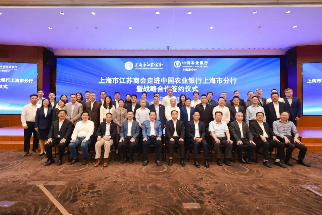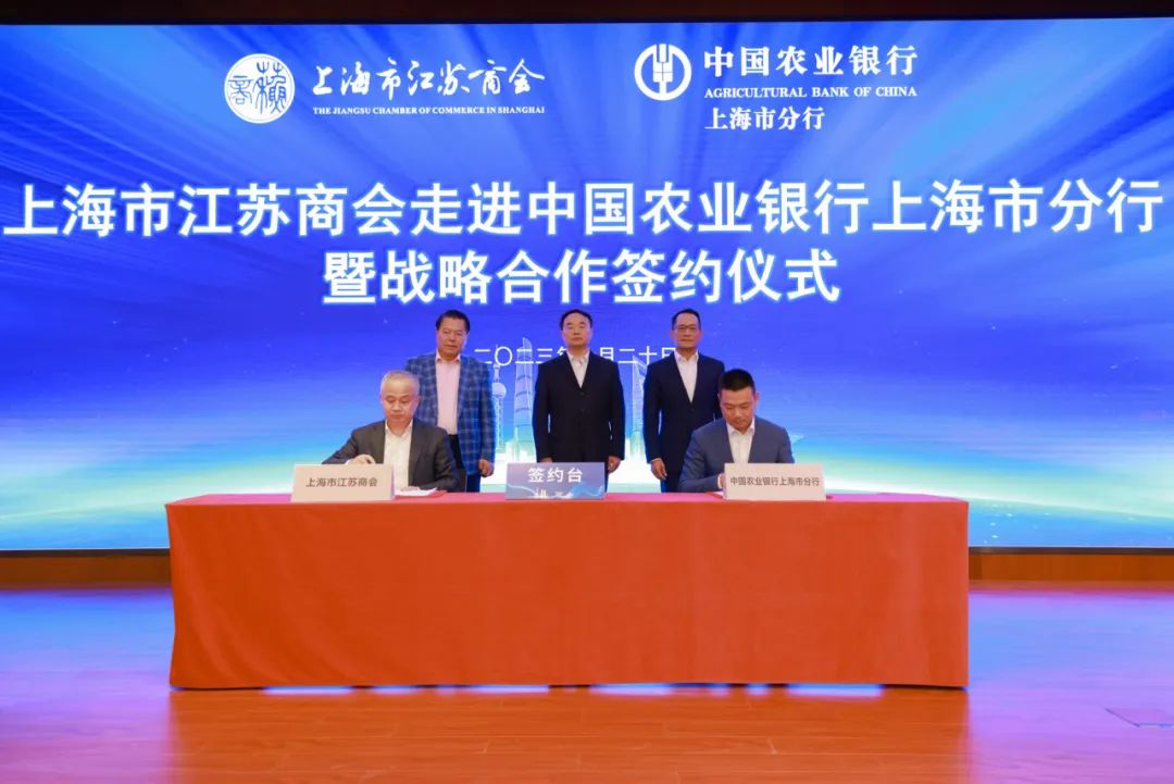 与会领导、嘉宾共同见证了上海市江苏商会与农业银行上海市分行战略合作签约仪式。农业银行上海市分行将在协议框架下提供500亿元人民币的意向性授信,为上海市江苏商会会员企业的发展提供金融支持。