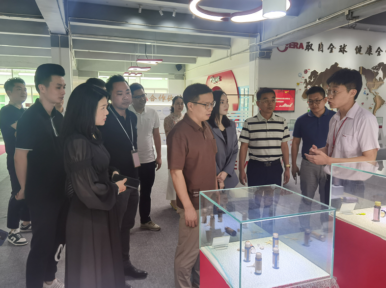 参观团首先来到会员企业时代生物科技(深圳)有限公司,实地了解公司产品研发历程,参观了产品从原料加工到灌装到出厂的全过程。在园山新联会的推动下,时代生物健康饮品已被评为园山街道工业产品十大手信之一。随后又参观了商会常务副会长所在单位深圳市慧天然控股集团有限公司并召开座谈会,现场观看了中茶5G智慧标准酝化仓——深圳一号,感受着以5G智能科技为内核,集“仓储、交易、展览、体验、品鉴”于一体的一站式茶产业全供应链的智能化系统。