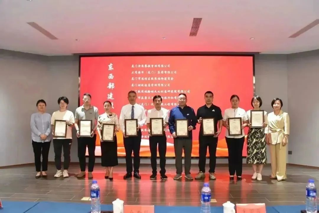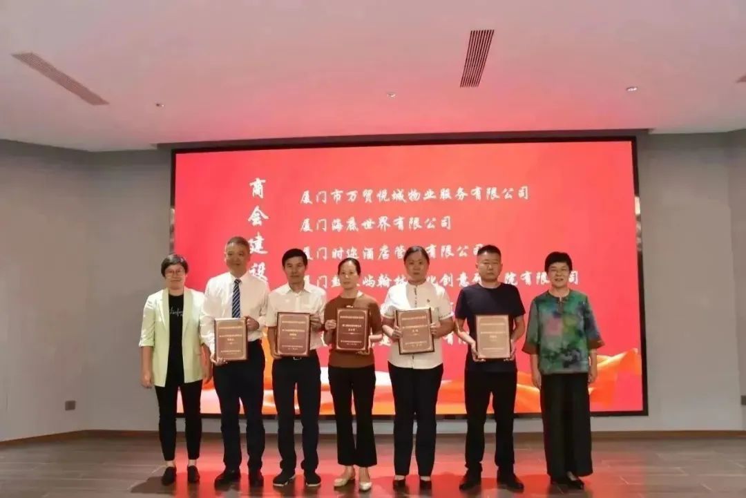 ▲思明区侨联主席苏枫红,思明区鼓浪屿街道党工委副书记、办事处主任陈雯雅为获得商会建设贡献奖的企业授牌