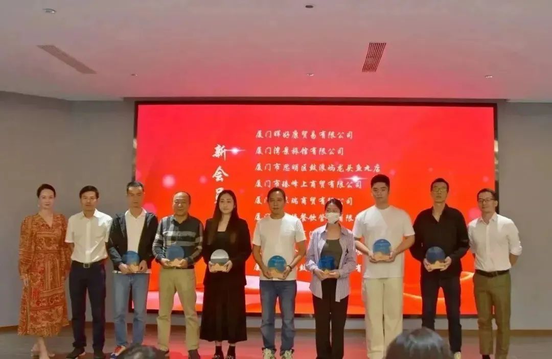 ▲鼓浪屿街道商会副会长林聪海、郑华盛,副秘书长谢仕茹为新入会员授牌