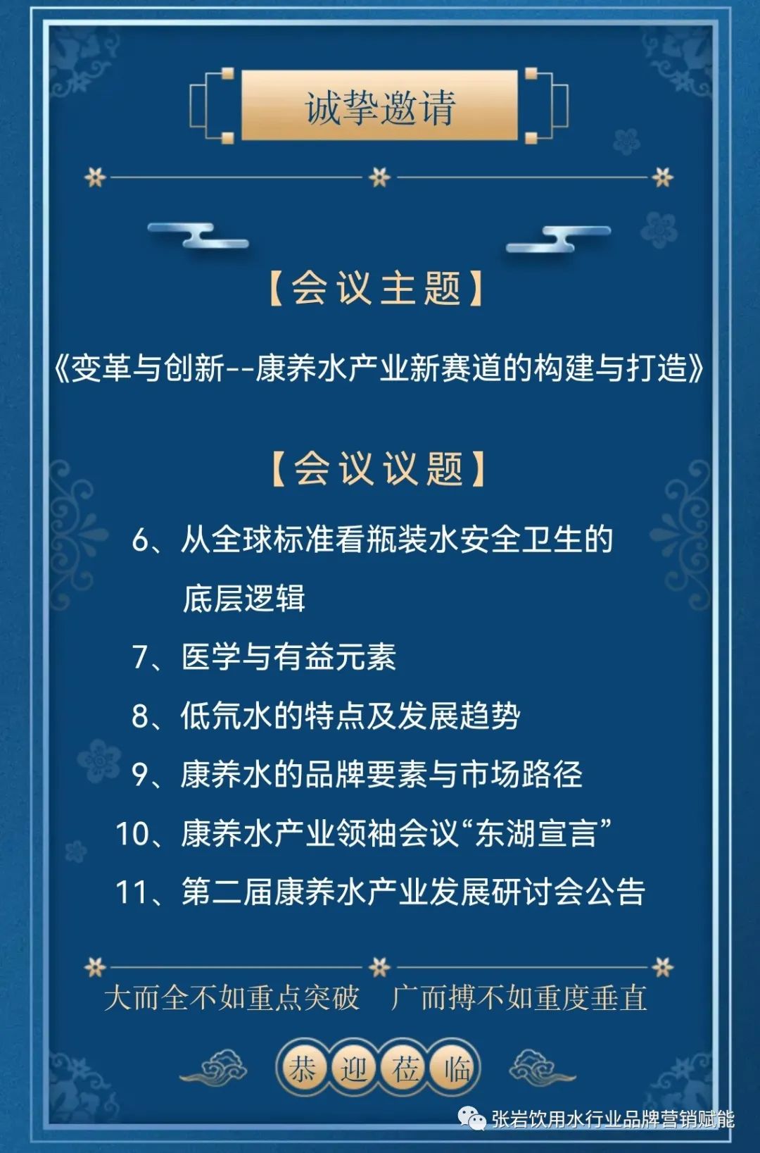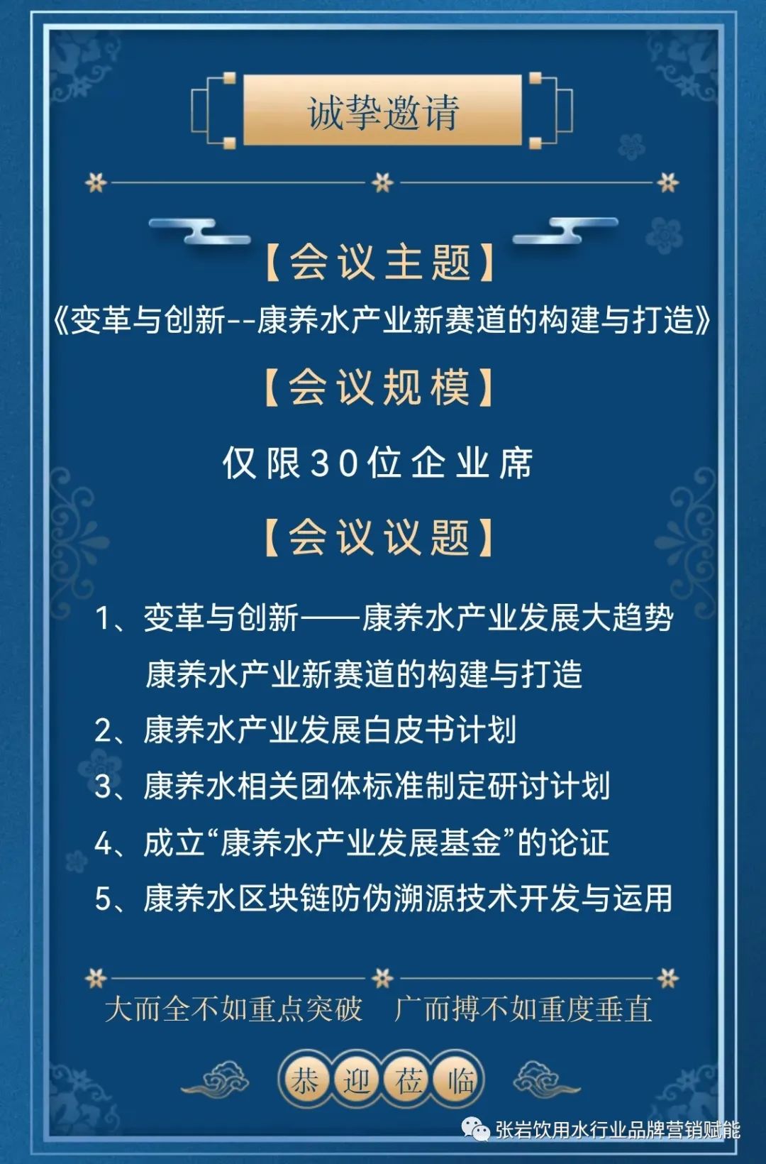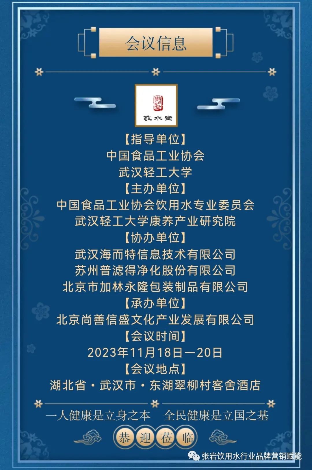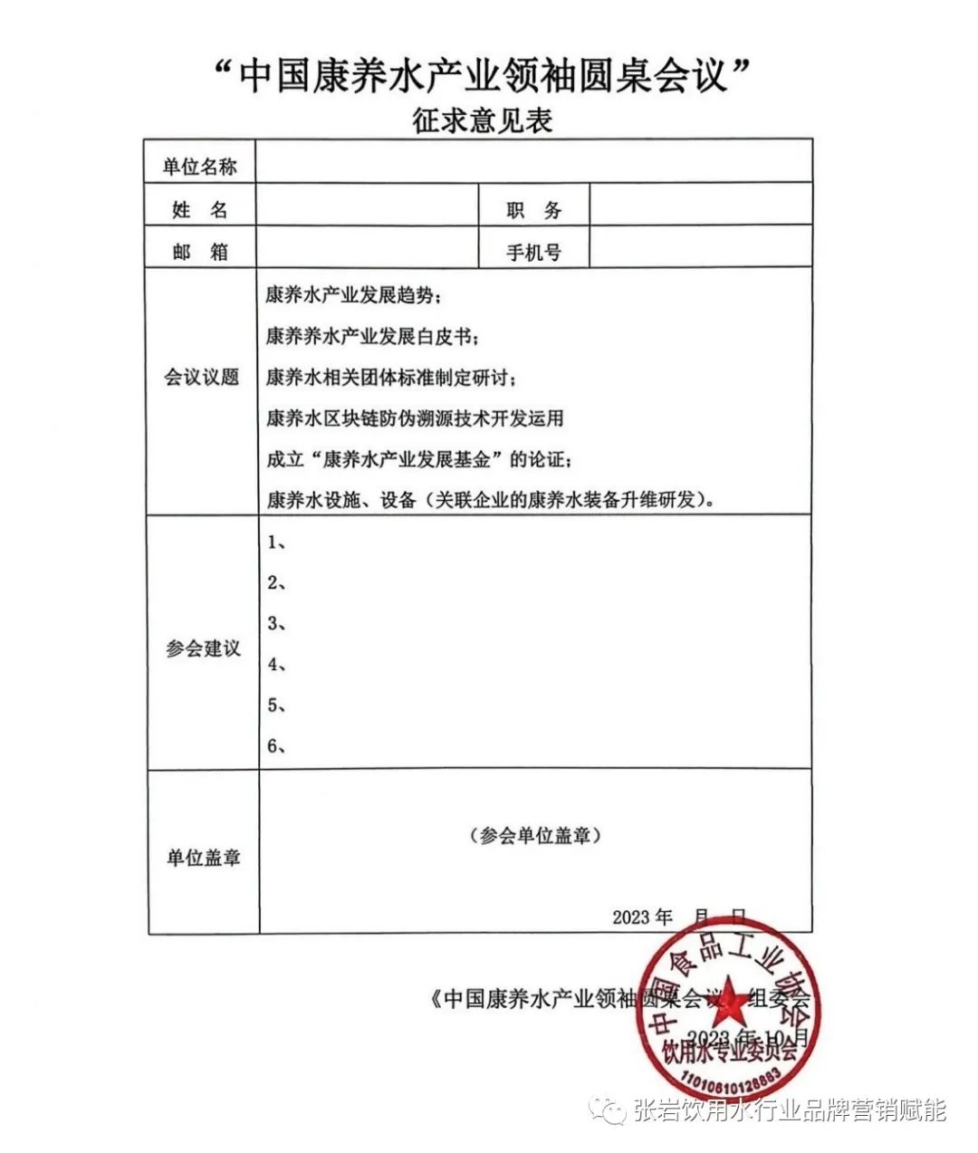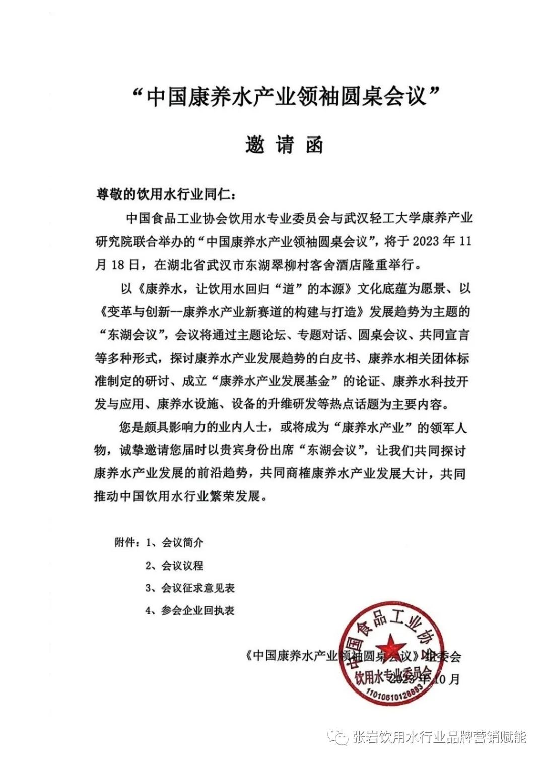 为贯彻落实《"健康中国2030"规划纲要》、《国民营养计划(2017-2030年)》和《健康中国行动(2019-2030年)》关于加强产业指导、规范市场秩序、科学引导消费,促进生产、消费、营养、健康协调发展的文件精神,中国食品工业协会饮用水专业委员会积极引导饮用水企业在建立营养健康管理体系、培养营养健康行动领导者、开发营养健康技术和产品创新等方面展开行动,满足人民群众日益增长的营养健康食物消费需求。 经研究决定,中国食品工业协会饮用水专业委员会将于2023年11月18日-20日在武汉市举办首届"中国康养水产业领袖圆桌会议"。报名咨询请与《中国康养水产业领袖圆桌会议组委会》联系