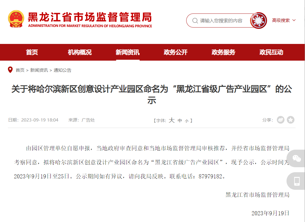 为贯彻省委省政府大力发展创意设计产业的战略部署,落实市场监管总局《“十四五”广告产业发展规划》任务要求,近日,黑龙江省市场监督管理局依据《黑龙江省级广告产业园区建设工作方案》,经过申报、初审、实地考察、评定、公示等流程,认为哈尔滨新区创意设计产业园区具备一定的产业规模,形成一定的聚集效应和可持续发展潜力,对全省和本地区广告产业发展起到示范、引领和促进作用,符合省级广告产业园区标准,予以认定哈尔滨新区创意设计产业园区提升为黑龙江省级广告产业园区,这是全省首家获得此项认定的产业园。