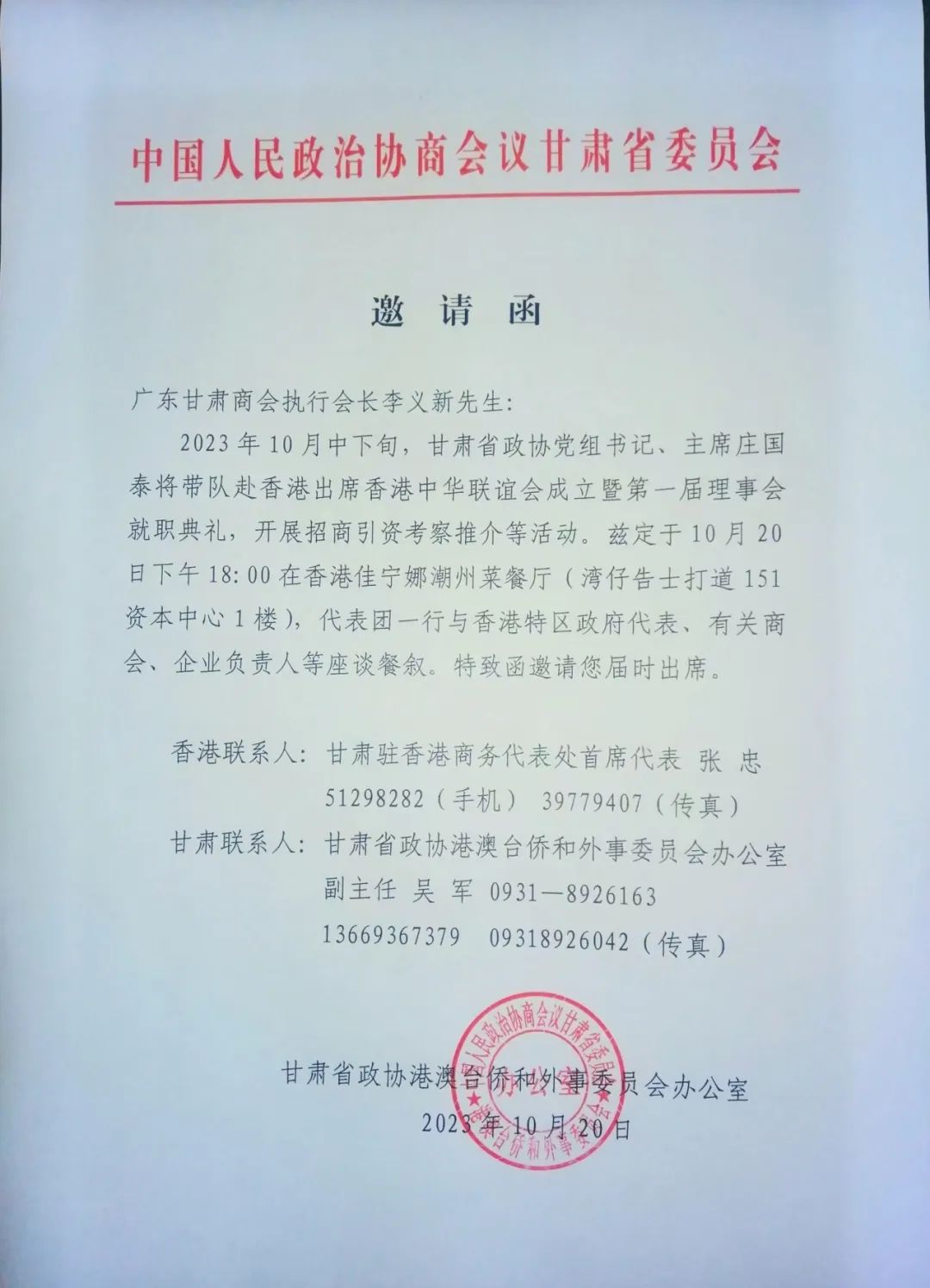 10月18日至21日,甘肃省政协党组书记、主席庄国泰率甘肃代表团赴香港参加香港中华联谊会成立暨第一届理事会就职典礼,期间在香港开展考察合作交流活动,与各界人士共话团结、共商合作。