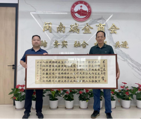 座谈会上,厦门市电脑业商会党支部书记、常务副会长、厦门市音视频协会秘书长张瑞清为闽南瑞金商会赠送了名家书法作品《沁园春·雪》。在此,感谢到访的兄弟商会各位领导!感谢张瑞清书记的盛情厚礼!