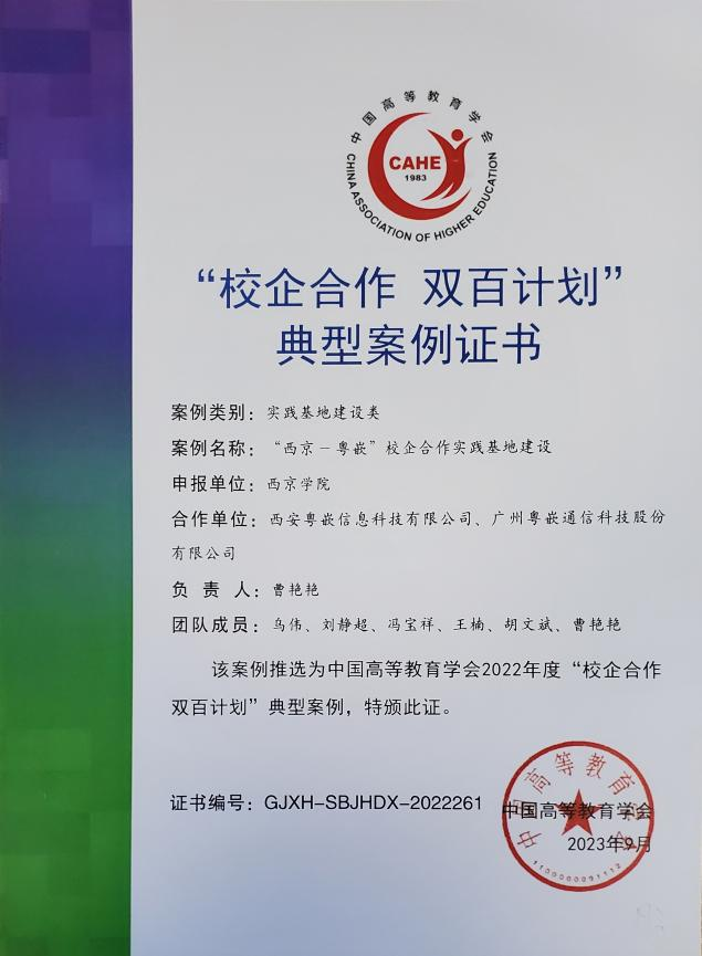 在“校企合作 双百计划”典型案例研讨会上,学校联合西安粤嵌信息科技有限公司、广州粤嵌通信科技股份有限公司,共同申报的实践基地建设类项目——《“西京—粤嵌”校企合作实践基地建设》,该案例被推选为中国高等教育学会2022年度“校企合作 双百计划”典型案例。