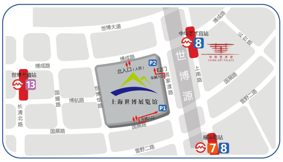 地铁8号线至中华艺术宫站3号出口,至上海世博展览馆北广场入场。