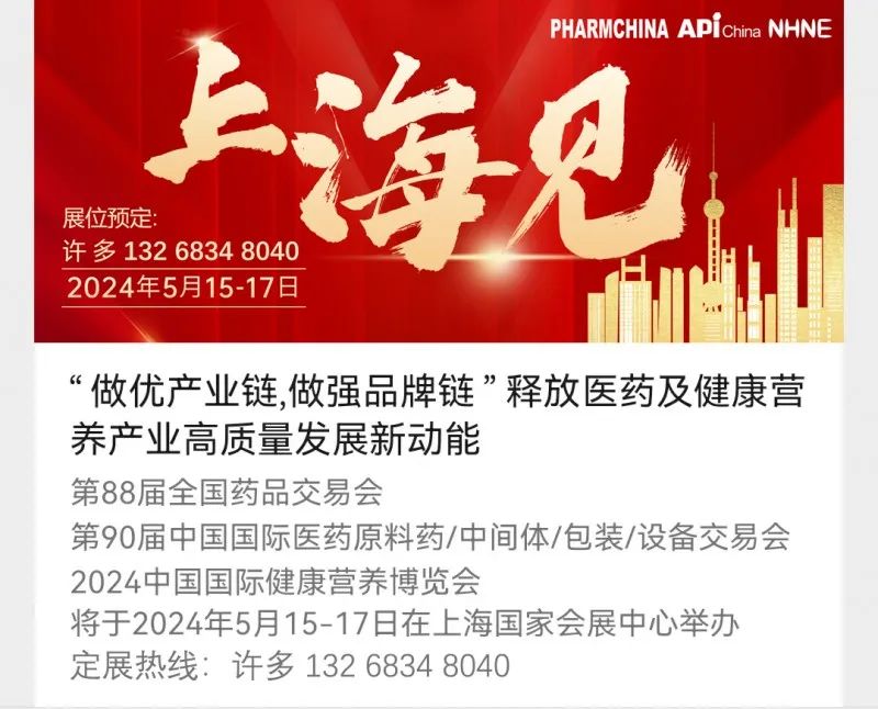 2024年5月15-17日将在上海国家会展中心举办的PHARMCHINA(全国药品交会)、API China(中国国际医药原料药/中间体/包装/设备交易会)、NHNE(中国国际健康营养博览会)展位销售工作现已全面启动。