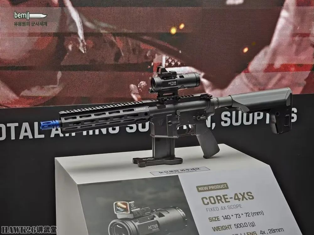 CORE-4XS瞄准镜,固定4倍,物镜直径28mm,瞄准镜重500克。瞄准镜顶部有安装座,已经配备了微型红点瞄准镜当作备份。这种配置非常重要,可以有效对付近距离快速移动的目标。