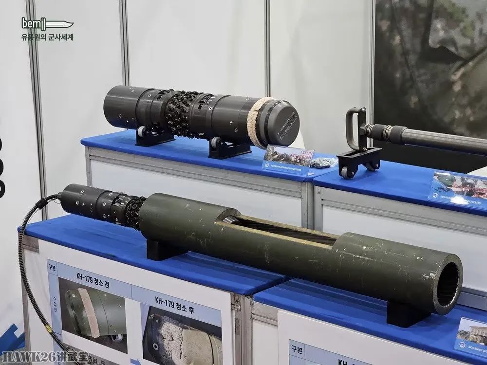 自动清洁炮管的装置,类似线控机器人,通过外侧布置的毛刷等清洁单元,将炮管内部的火药残渣、挂铜等污垢进行清洁,能够极大减轻士兵的工作强度。现场还有炮管解剖模型,用来展示这种装置的工作状态。
