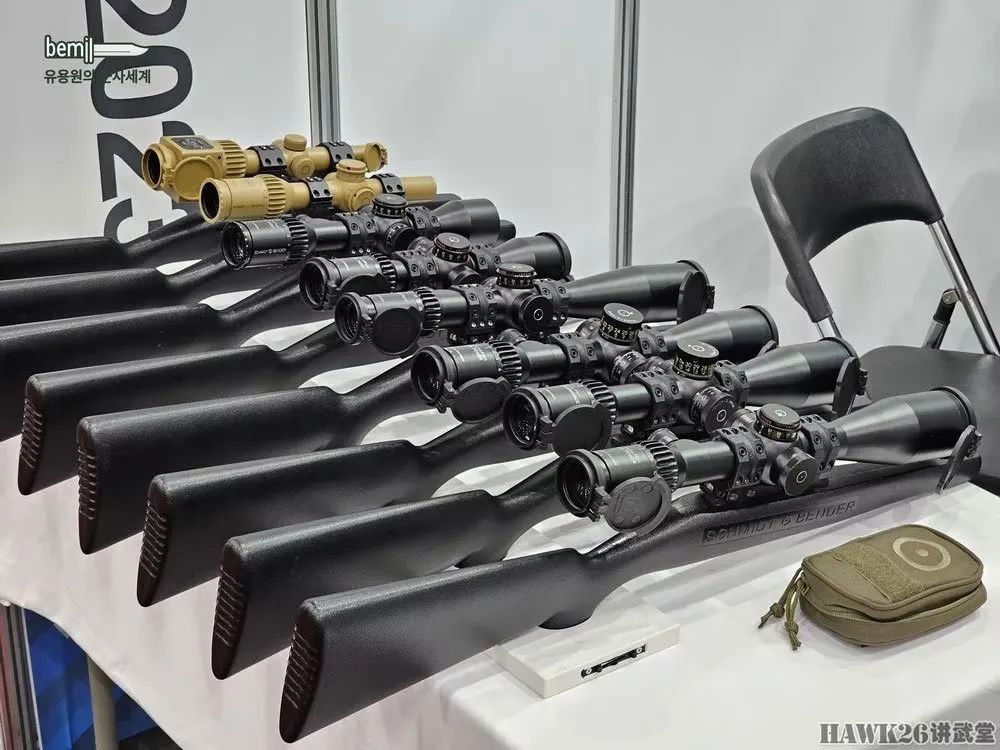 施密特-本德公司展示的各种瞄准镜,展台过于简单,似乎只是该公司产品的代理商。施密特-本德是德国著名的光学器材制造商,近年来产品质量出现滑坡,被许多用户吐槽。需要说明的是,由于中国被欧美国家制裁,档次较高的瞄准镜同样属于被禁售范围。如果个人去外国购买瞄准镜,需要注意询问是否在禁售范围,否则很可能会在海关被没收。