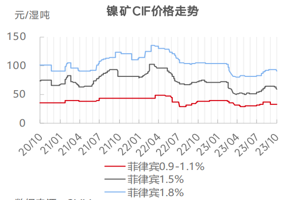 上周价格下调1.9美元/湿吨。截至本周四,印尼镍矿配额事件尚未落地,但下游冬储已基本完毕叠加镍生铁价格持续阴跌导致国内镍生铁厂家预期悲观,从而对高矿价存有畏高情绪,镍矿贸易商出货意愿较强,从而周内镍矿价格出现下行趋势。年内镍矿供给1偏紧情绪不改。且据SMM调研了解国庆后印尼主流铁厂暂未采购新的镍矿,镍矿市场成交情绪回落,镍铁价格小幅下调。