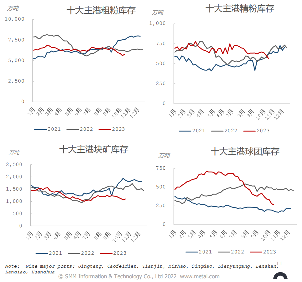 万吨。本周粗粉、精粉到港量有所上调,块矿及球团到港量略有下降。本周整