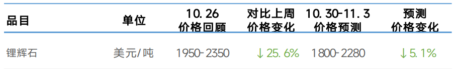 本周锂辉石精矿cif价格大幅下探。在经历了10月份与海外矿山的交涉后,部分长单的定价方式或将