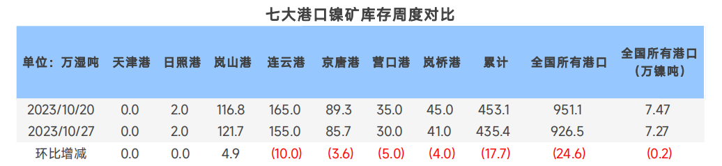 10月27日,全国港口镍矿库存较10月20日下降24.6