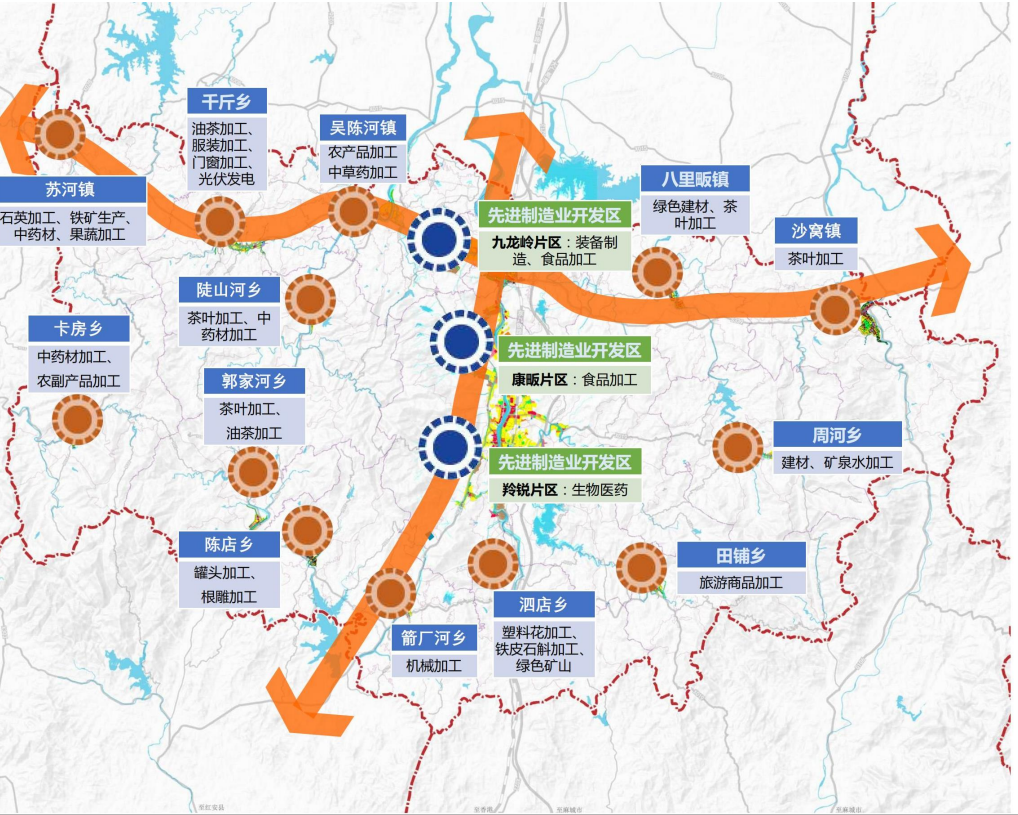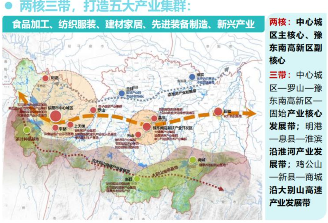 并结合各片区资源优势,以信阳市中心城区为核心、豫东南高新区为副核心,设立中心城区-罗山-豫东南高新区-固始产业核心发展带,明港-息县-淮滨-沿淮河产业发展带,鸡公山-新县-商城县沿大别山高速产业发展带,打造五大产业集聚群:食品加工、纺织服装、建材家居、先进装备制造、新兴产业。
