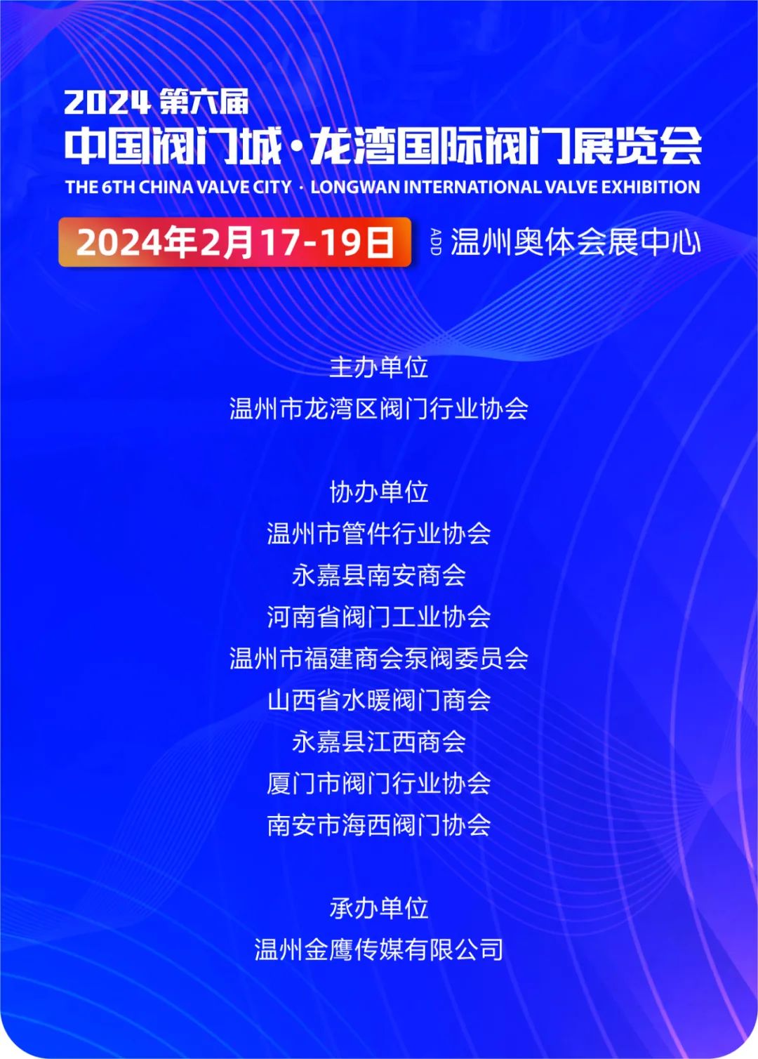 以“协同创新,聚力同行”为主题的第六届中国阀门城·龙湾国际阀门展览会将于2024年2月17-19日(正月初八-初十)在温州奥体会展中心举办,展览会由温州市龙湾区阀门行业协会主办,温州金鹰传媒有限公司承办。作为行业内专业、权威的阀门展会,自2017年首届举办以来,得到政府、商会行业协会、合作伙伴以及参展商和采购商观众的鼎力支持。展会旨在打造一个交流和展示平台,引导和推动阀门企业加速转型和创新,展出中国阀门产业的新技术、新产品、新解决方案和优秀的企业形象,推动阀门产业的创新发展,让更多人知道中国阀门企业的创新能力和品牌影响力。本届展会将有近500家制造企业展出,阀类、泵类、管道、执行机构、机械设备、配件、气动元件等上万种产品在此次展览会中展出。
