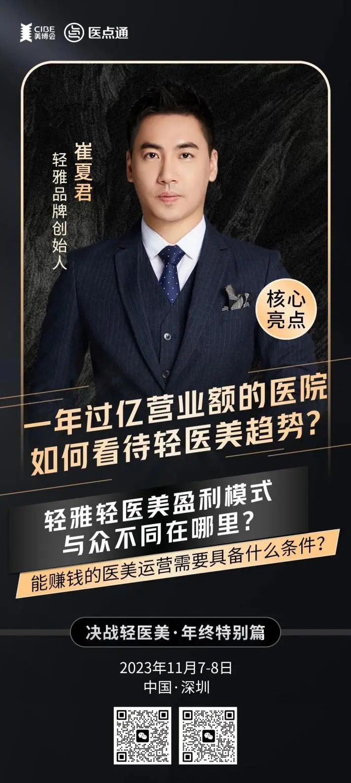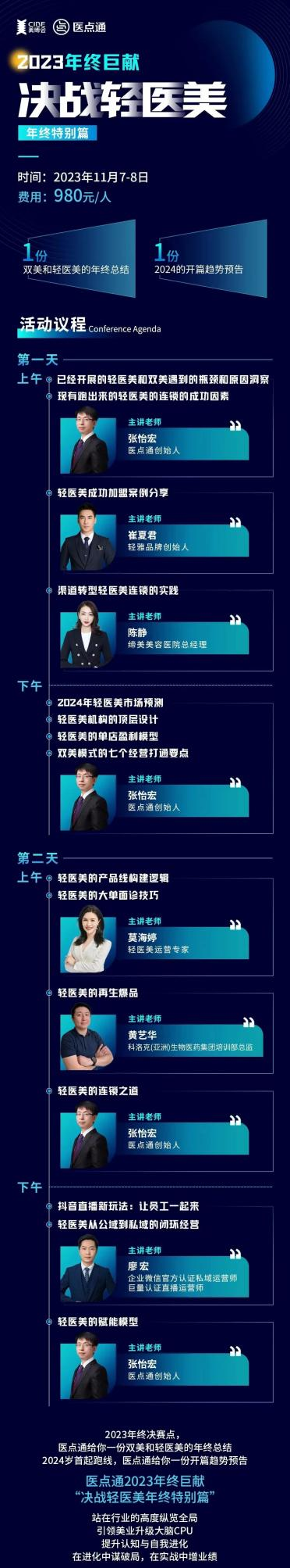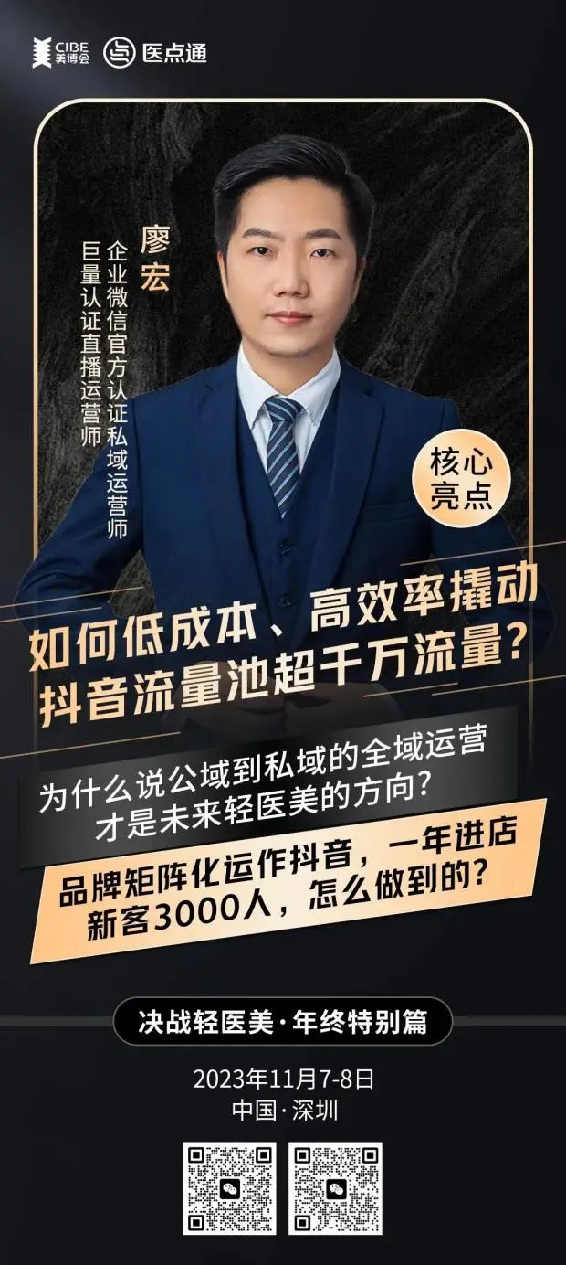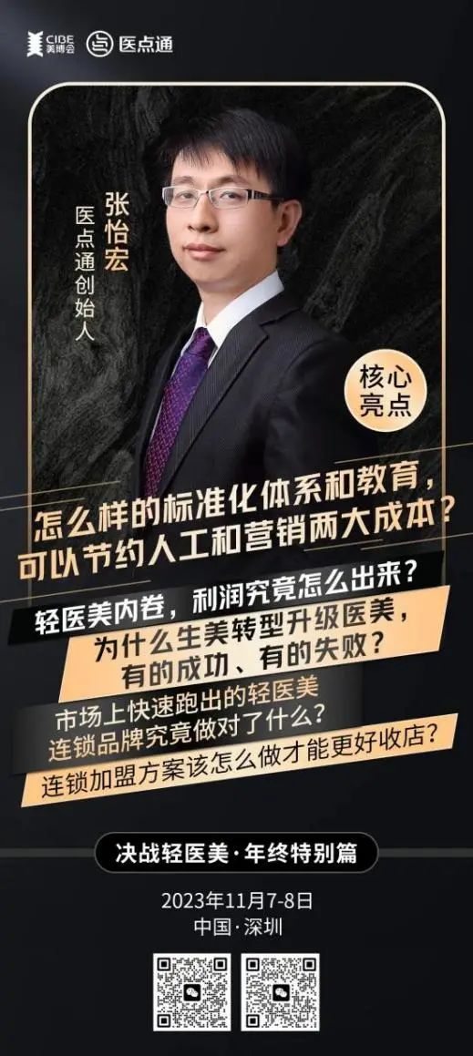 曾任三家上市医美机构总经理或院长,拥有多年直客及渠道全盘操作经验,担任多个医美国际论坛主席的医点通管理咨询创始人张怡宏先生《现有跑出来的轻医美的连锁的成功因素》《2024年轻医美市场预测》《轻医美机构的顶层设计》《轻医美的单店盈利模型》《双美模式的七个经营打通要点》《轻医美的连锁之道》等演讲分享,用全局视野多维输出十几年来扶持上千家机构的智慧精髓,解析底层逻辑,让机构明晰成功路径,助力标准化、系统化提升与裂变。