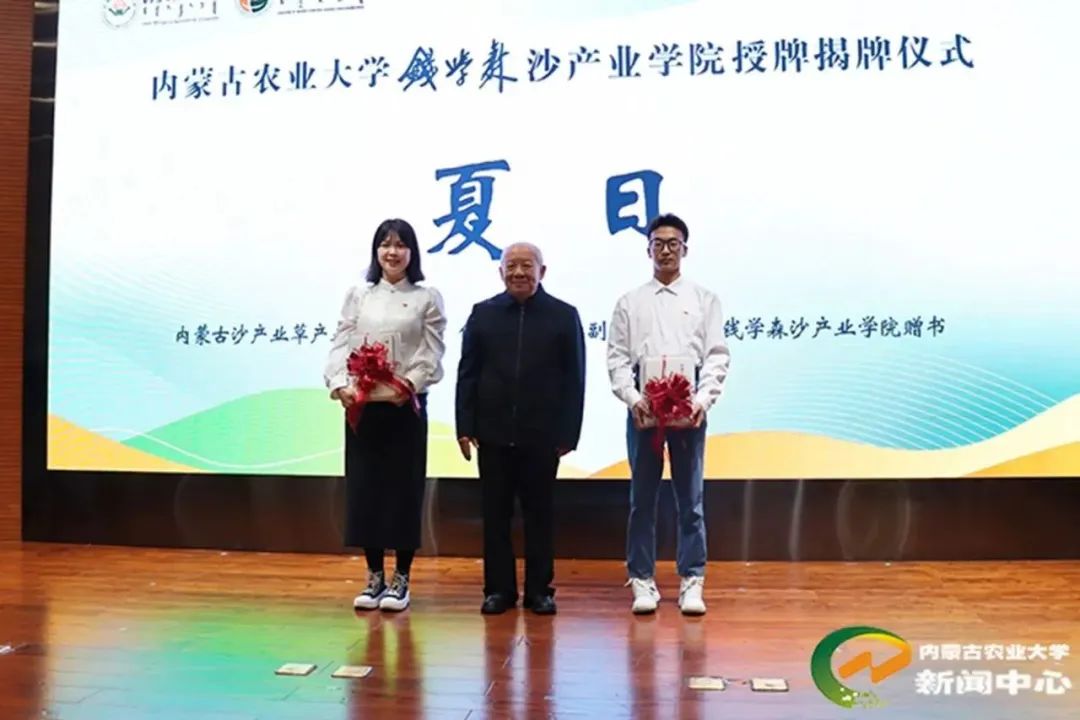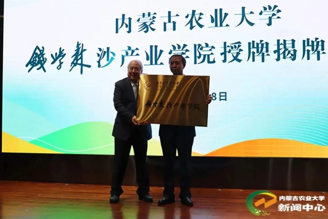 仪式上,代钦、谭光明、杨劼、尹伟伦、钱永刚、陈永胜共同为钱学森沙产业学院揭牌。高聚林为钱学森沙产业学院共建理事单位授牌。内蒙古沙产业草产业协会顾问、自治区政协原副主席夏日向钱学森沙产业学院赠书。内蒙古太伟生态科技有限公司总经理张忠青代表学院共建理事单位讲话。