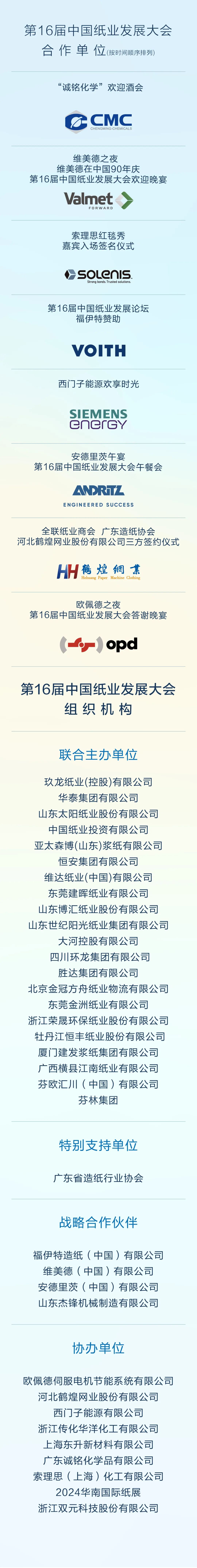 纸业商会理事长、玖龙纸业董事长张茵,名誉会长、太阳纸业董事长李洪信,名誉会长、华泰集团董事局主席李建华,名誉会长、恒安集团创始人、董事局副主席许连捷,纸业商会顾问、中国造纸学会理事长曹振雷,纸业商会轮值会长、环龙集团董事长沈根莲,常务会长黎桂华、李晓亮、方聪艺,副会长胡伟、张健、黎俊钦、林新阳、雷文军,特邀副会长杨国华、宋望球,副会长单位领导、中国纸业党委副书记、总经理钟天琦,厦门建发纸业副总经理杨文利,恒丰纸业总经理关兴江,阳光纸业副总经理李金海,大会联合主办单位领导宋海海,欧洲造纸联合会总干事Jori Ringman,广东造纸协会、中国造纸协会生活用纸专业委员会、浙江省造纸协会的领导和第16届大会赞助合作单位福伊特、安德里茨、西门子能源、杰锋机械、欧佩德伺服电机、鹤煌网业、传化华洋、上海东升、诚铭化学、索理思、励展集团、双元科技等单位的领导和代表出席了论坛。