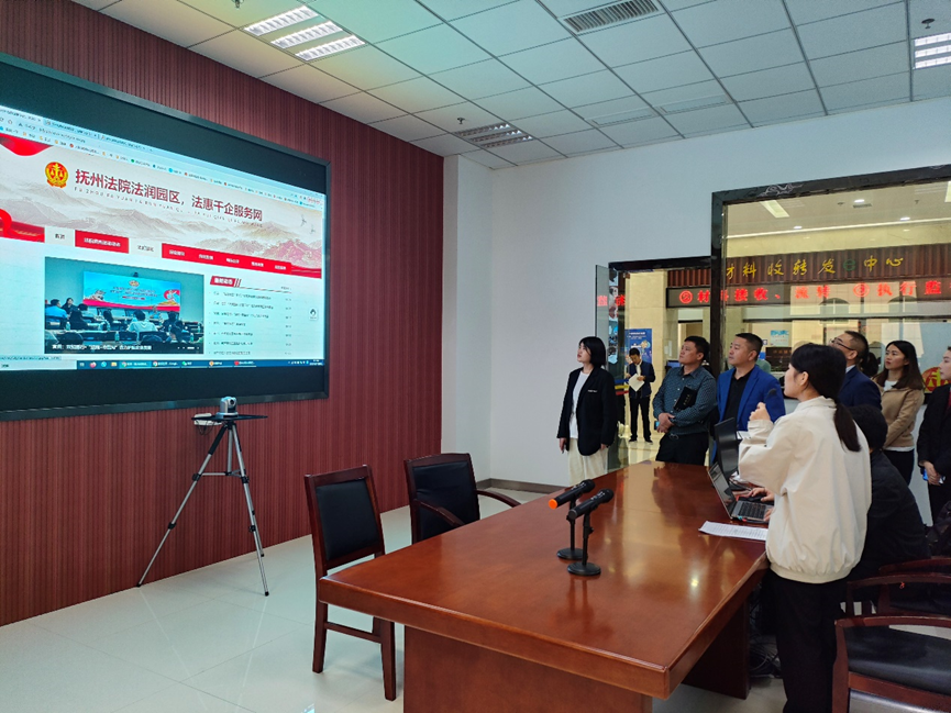 与会人员在服务中心认真学习智能文书生成和诉讼风险评估一体机的使用,及抚州法院“法润园区、法惠千企”服务网线上操作方法等。