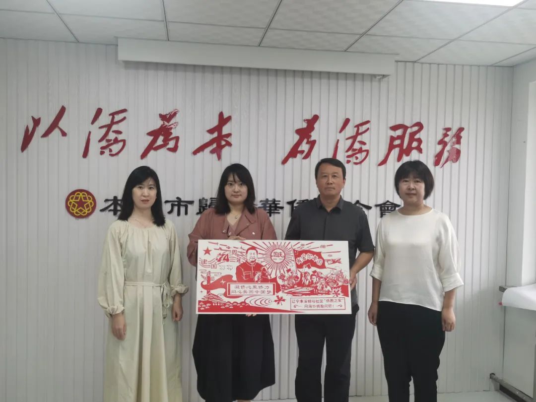 8月28日,明山区侨联,明山区高峪街道锦峪社区“侨胞之家”负责同志来到市侨联,代表锦峪社区“侨胞之家”向英国东北商会、英国东北同乡会及海外侨胞赠送剪纸作品——《五湖四海庆华诞·同心共圆中国梦》。