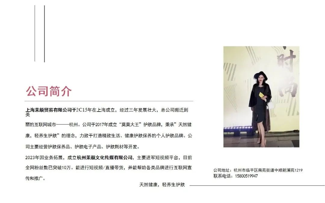 2023年因业务拓展,成立杭州茉颜文化传媒有限公司,主要进军短视频平台,目前全网粉丝数已突破10万。能进行短视频/直播带货,并能帮助各类品牌进行互联网宣传和推广。