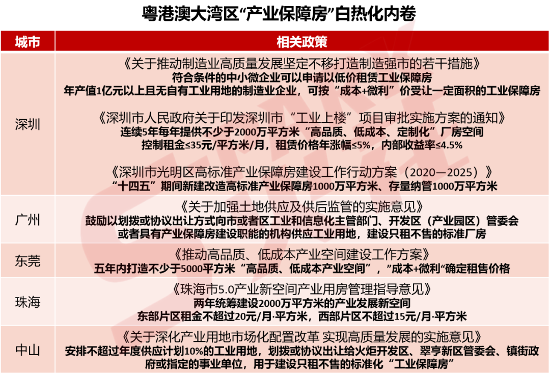 随后广州也跟上了,在其8月份发布的《广州市关于优化空间载体支撑制造业高质量发展的实施意见(公开征求意见稿)》《关于推动工业用地高效利用的若干措施(公开征求意见稿)》《关于支持工业厂房建设的若干措施(公开征求意见稿)》《关于加快工业园区高质量发展的若干措施(公开征求意见稿)》四大文件中,明确提出了“支持各区将工业用地划拨给工业和信息化主管部门、开发区(产业园区)管委会或者具有产业保障房建设职能的机构,用于建设只租不售的产业保障房。”
