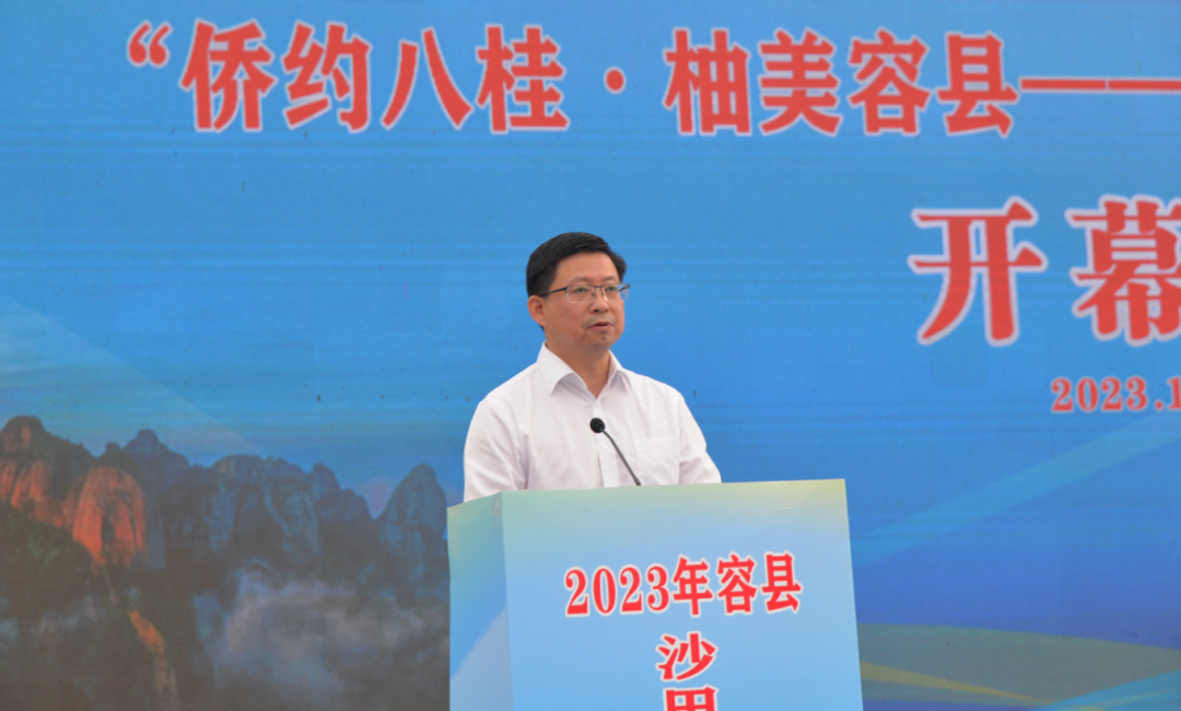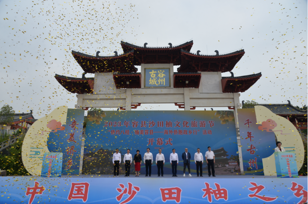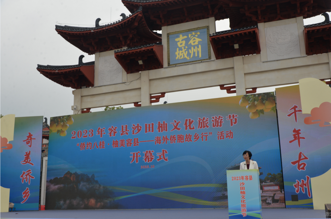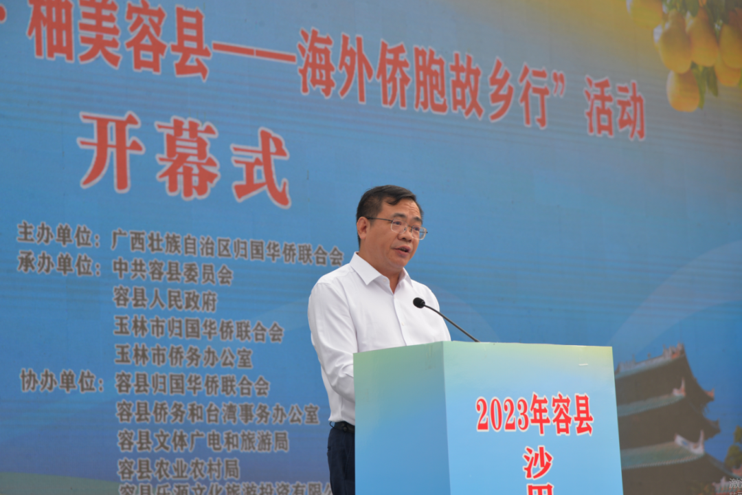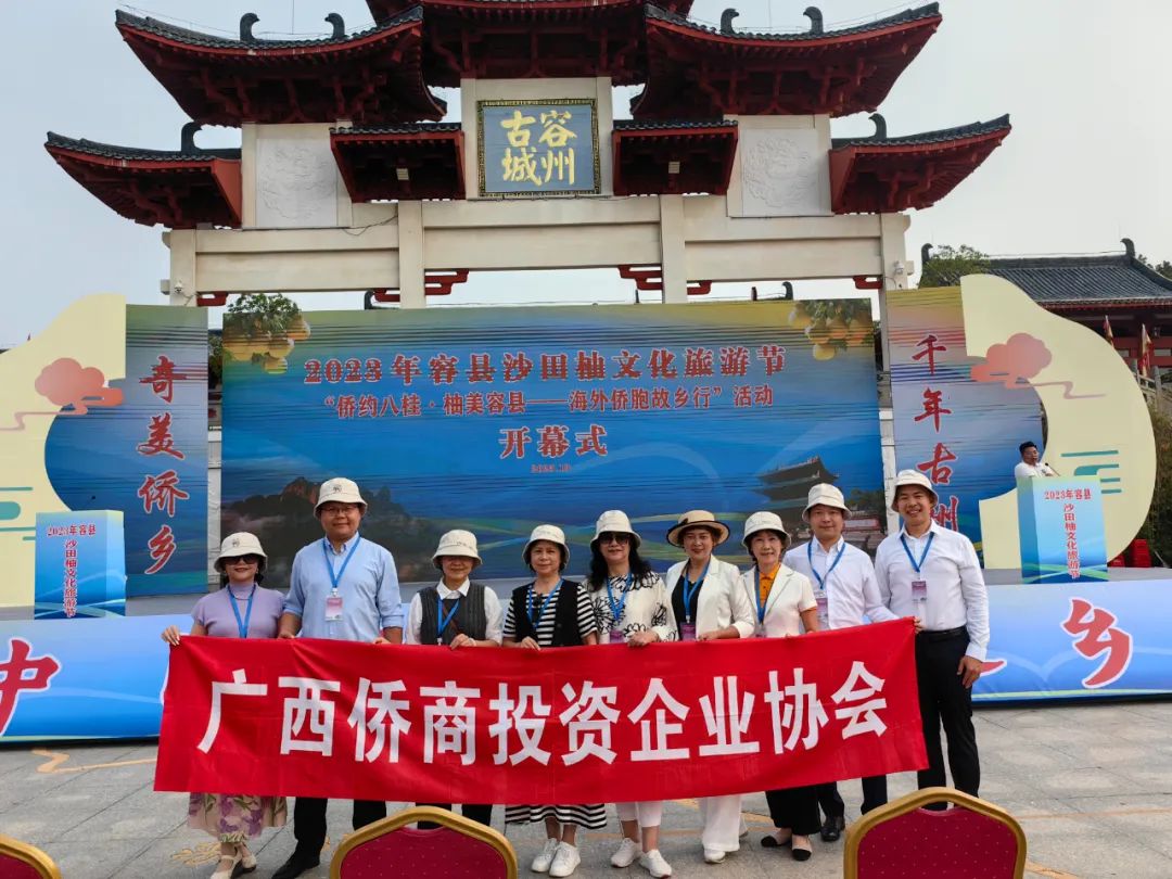 10月27日上午,由自治区侨联主办,中共容县委员会、容县人民政府、玉林市侨联、玉林市侨办承办,容县侨联、容县侨台办、容县文广旅游局、容县乐源文化旅游投资有限公司协办的“侨约八桂·柚美容县--海外侨胞故乡行”活动在容县开幕。自治区侨联党组成员、副主席秦伟鹏,玉林市市委常委、统战部部长邓国忠,容县县委书记甘文波,玉林市委统战部副部长、市社会主义学院党组书记、市侨办主任罗小洁,自治区侨联兼职副主席、市侨联主席杨志光,香港东吴国际证券有限公司高级总裁蔡昀凌,以及来自14个国家和地区100多名侨领侨商出席开幕式。邓国忠宣布2023年容县沙田柚文化旅游节开幕及“海外侨胞故乡行”活动正式启动。开幕式由容县县委副书记、县长罗莉主持。广西侨商会代表出席本次活动。