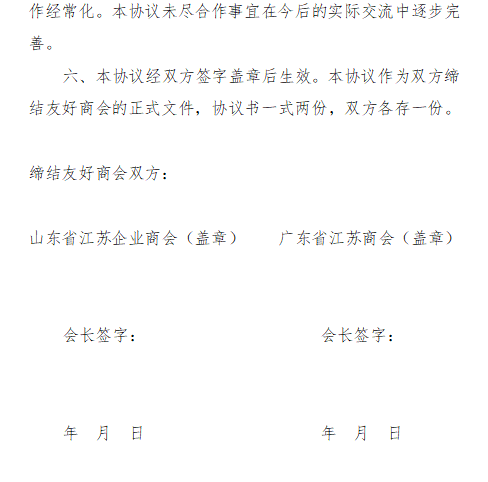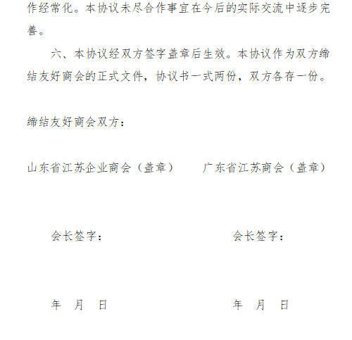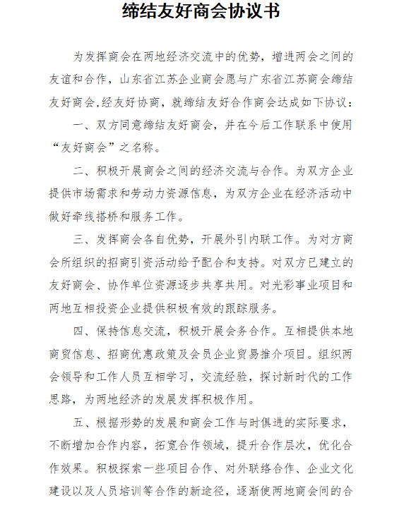 为进一步发展双方友好关系,加强交流协作,促进经济繁荣,经过近阶段的友好协商,广东省江苏商会与山东省江苏企业商会缔结友好商会关系。