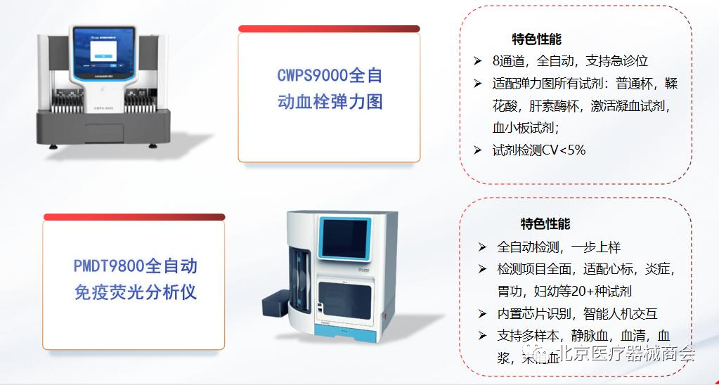 凝血产品线:全自动血栓弹力图 CWPS9000 于 2023 年 3 月 31 日获证,并走向市场。8 通道(模块化支持 32 通道);48 样本位(支持原始采血管直接上样);200 测试/天(每天 12 小时开机时间计算);全试剂支持普通杯、鞣花酸、血小板、肝素、快速。