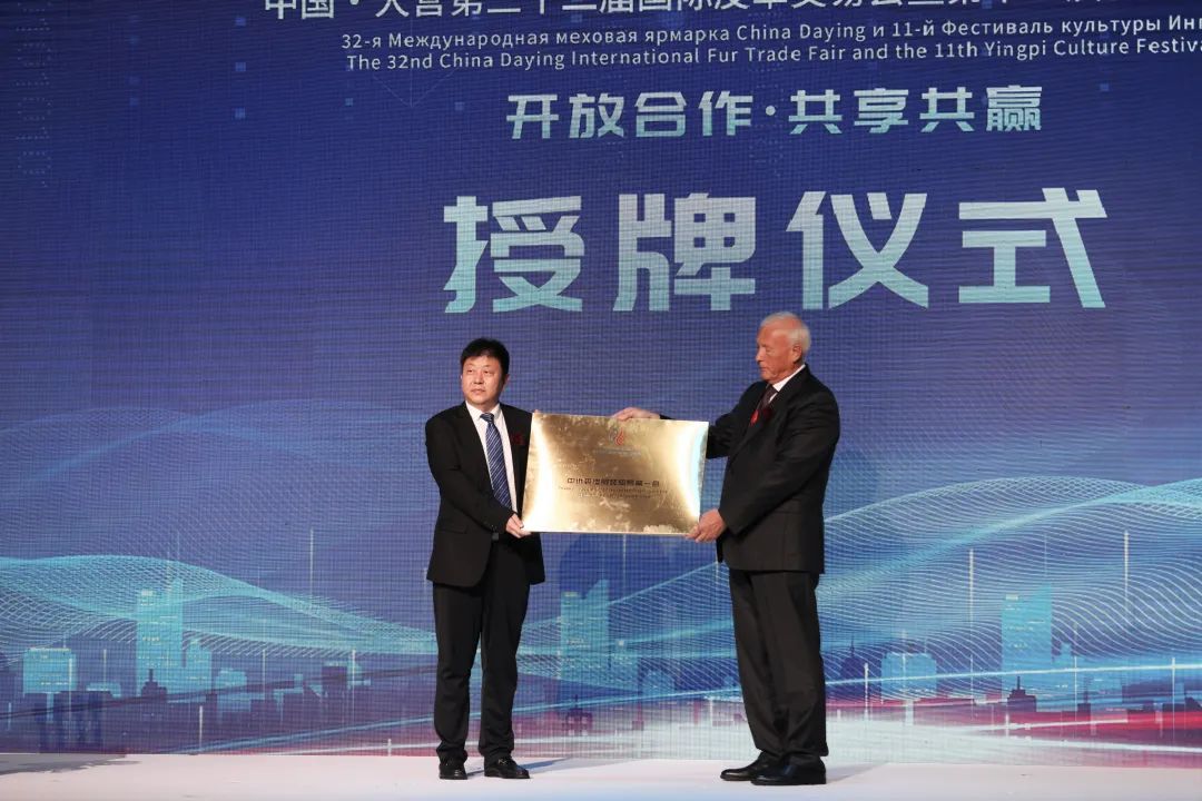 谢尔盖•斯托尔博夫向枣强县颁发“中俄裘皮服装贸易第一县”牌匾,副县长朱金池接受了牌匾。