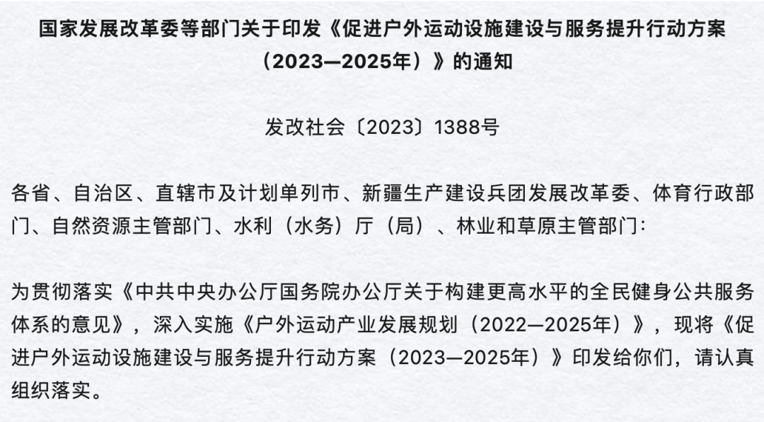 国家发改委等部门印发《促进户外运动设施建设与服务提升行动方案(2023—2025年)》